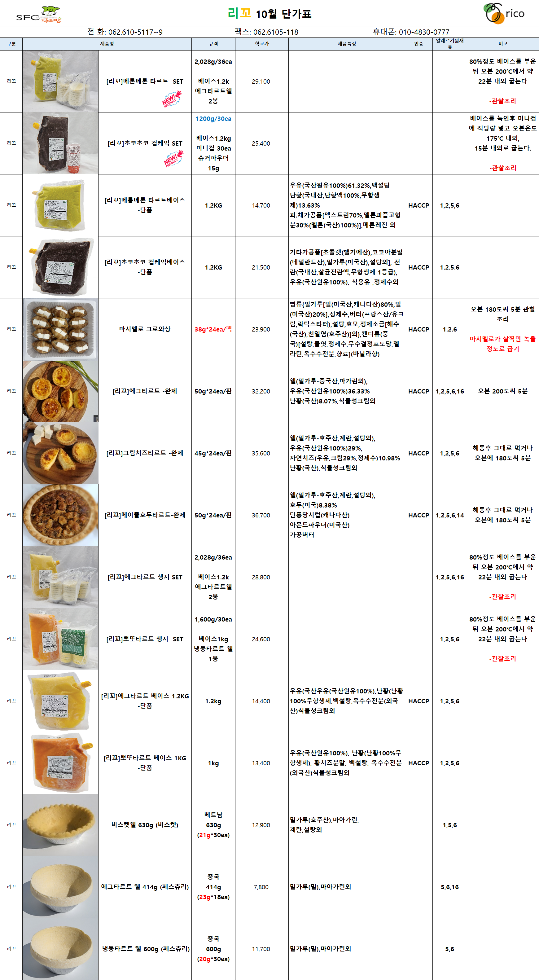 ***SFC푸드맘 리꼬 (마시멜로 크로와상, 타르트, 쉘/도우) 10월 단가표입니다.***