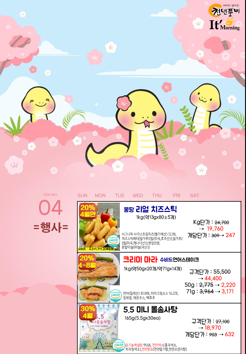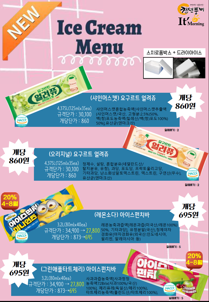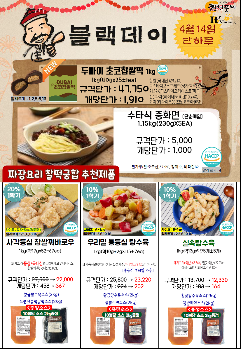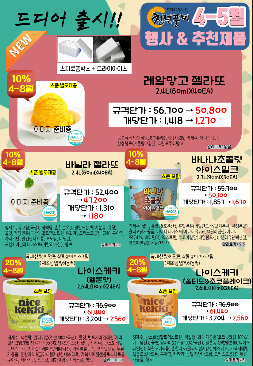 ◈≪≪도래샘푸드≫≫❤️▶[천년풍미/잇모닝]◀❤️4월 총단가표(지구의날(초코가나슈티그레),블랙데이,젤라또,얼려쭈,딸기생크림비스킷슈,포시즌딸기요거트케익,블랙데이