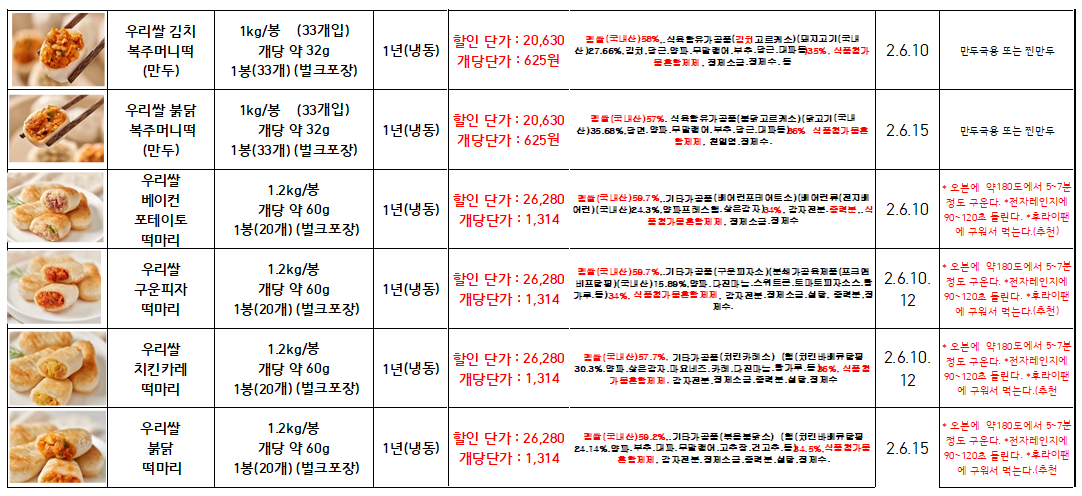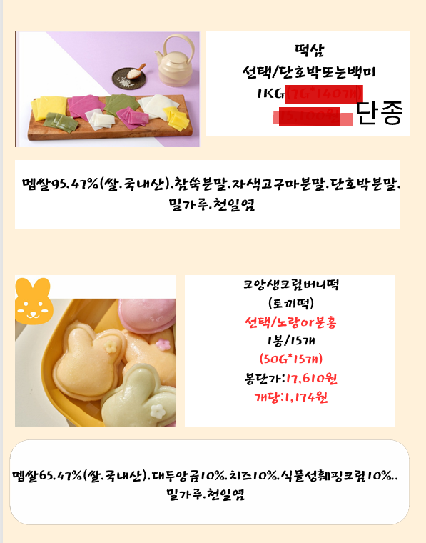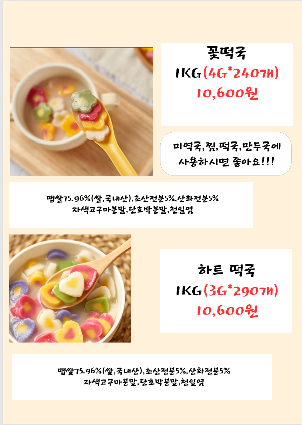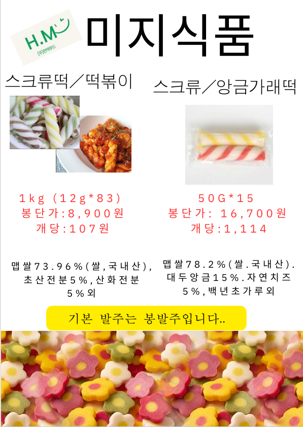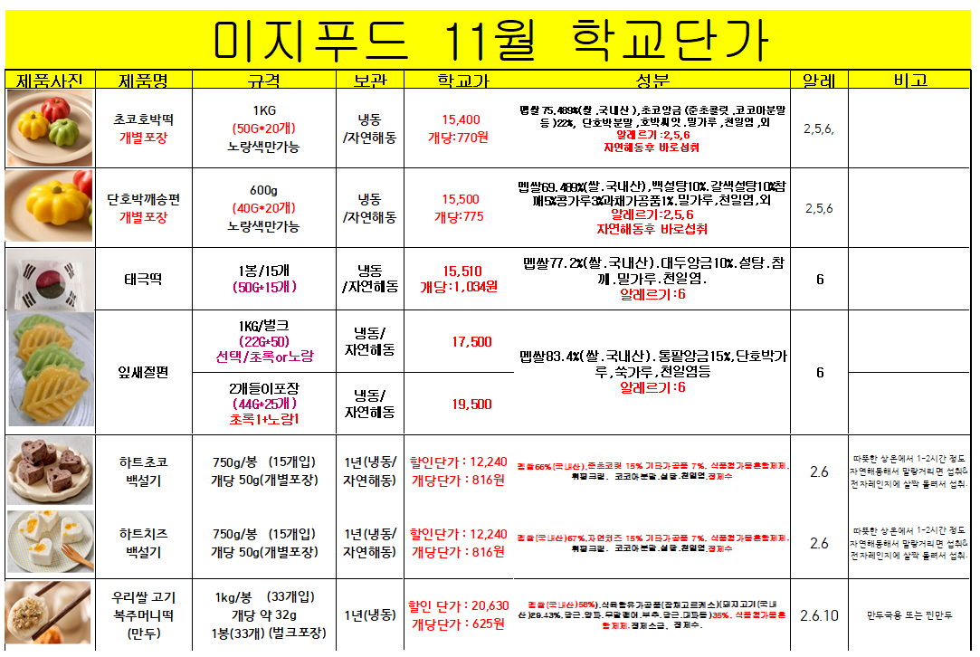 ◈◈한맥푸드◈◈ 미지푸드(꽃떡국,하트떡국,떡마리 등등) 11월 단가표