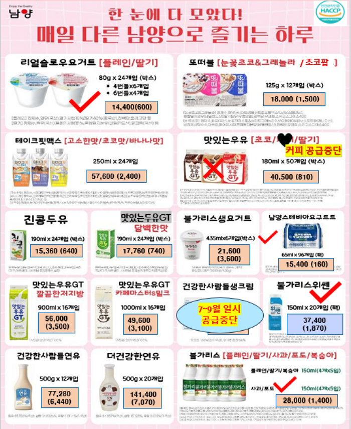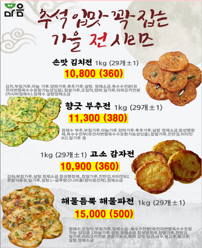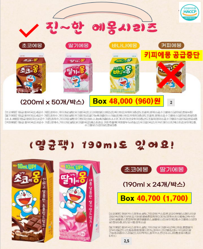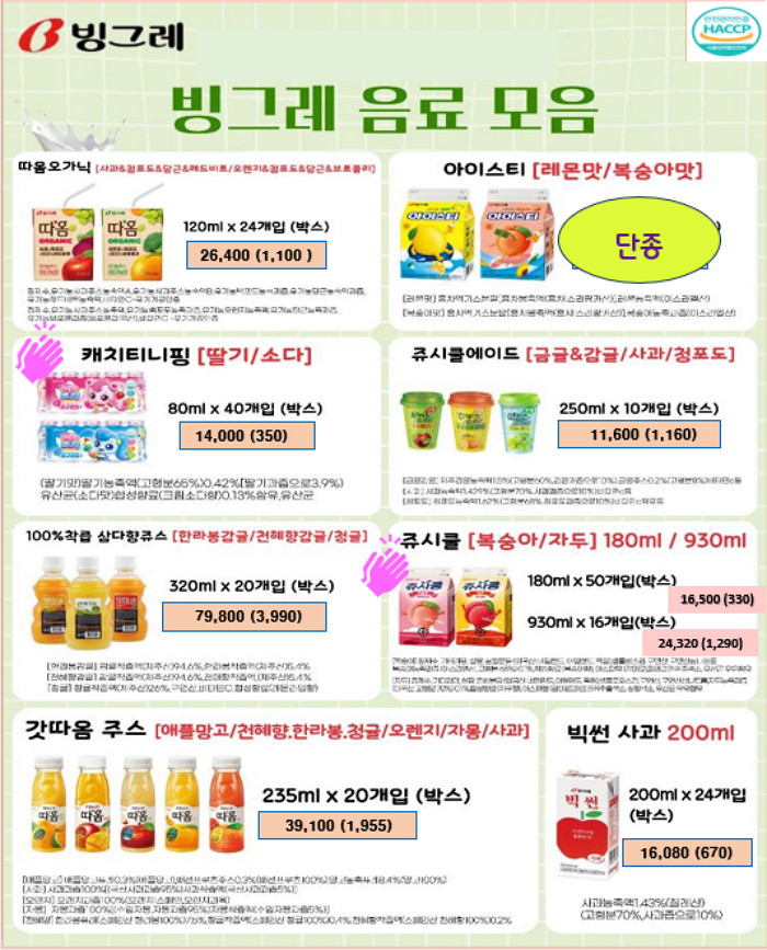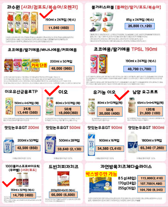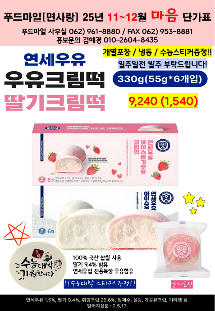** 푸드마일 마음 11~12월 단가표 입니다 ** 연세우유딸기크림떡, 창억떡, 서울우유, 남양유업, 빙그레, 참나무캠핑꼬지 , 떡갈비, 신의주순대국밥세트, 크로플, 스모어쿠키,사과당근주스, 배주스, 앙버터호두과자, 호떡, 붕어빵, 찐빵, 폭립, 차슈,,,,