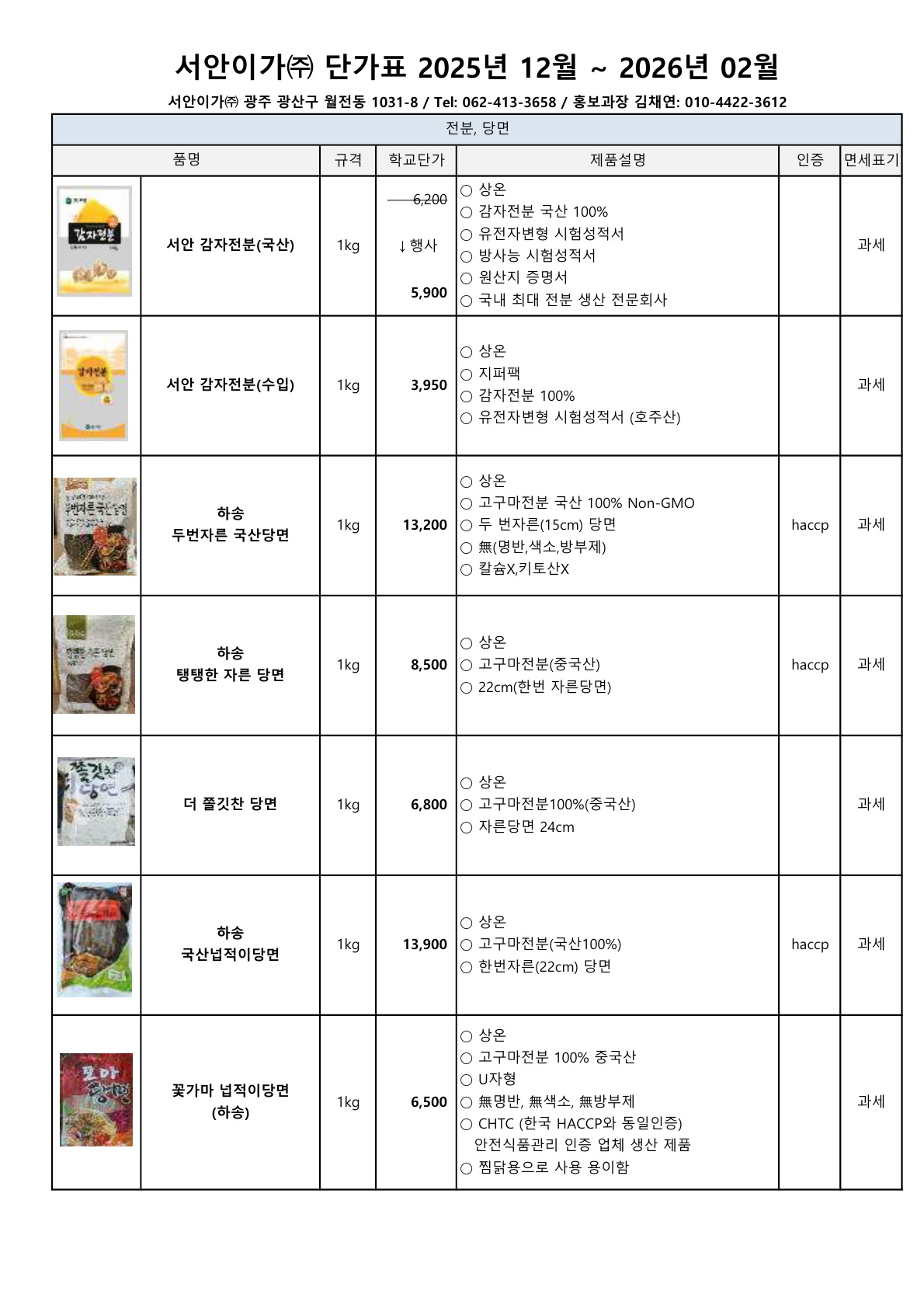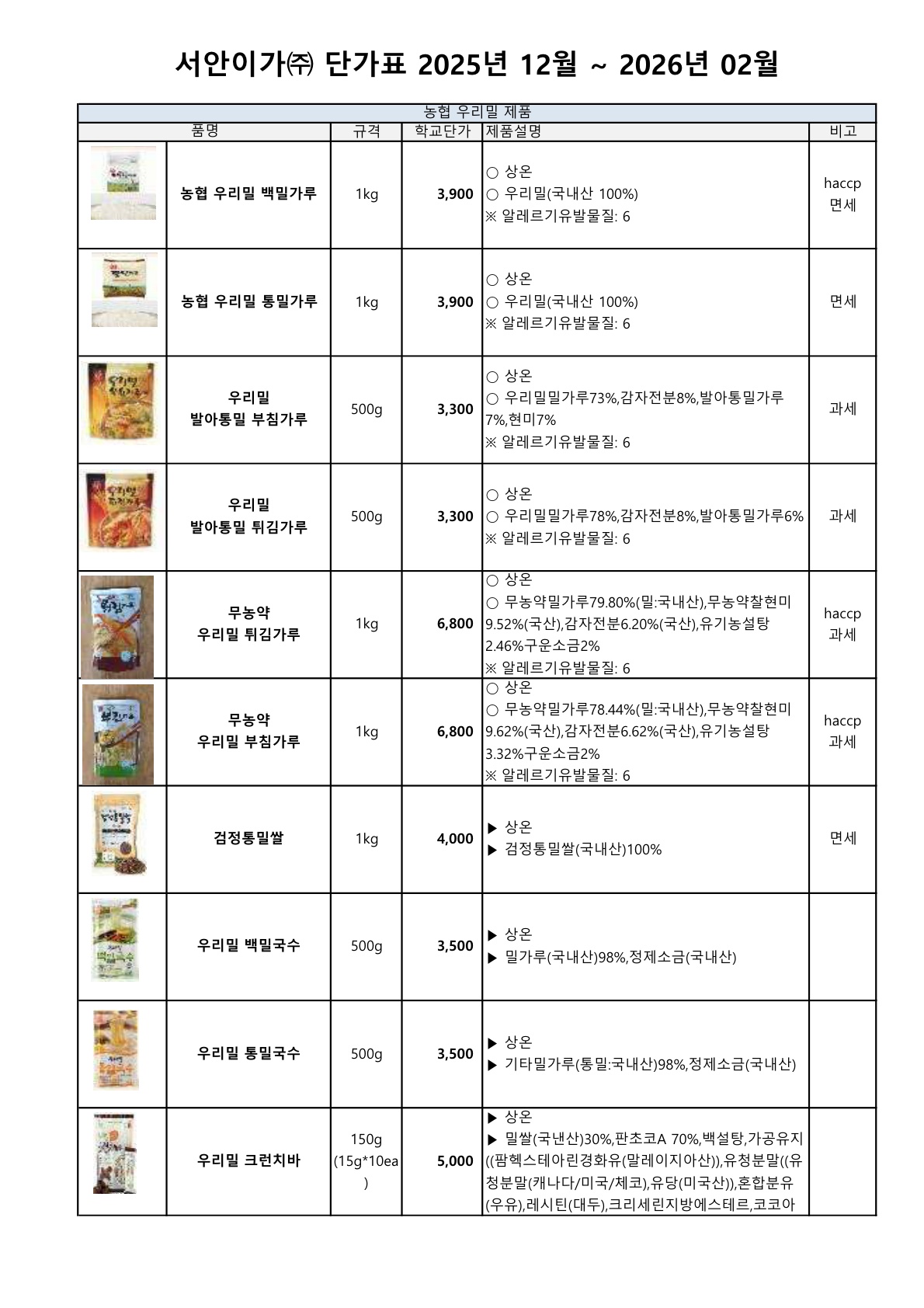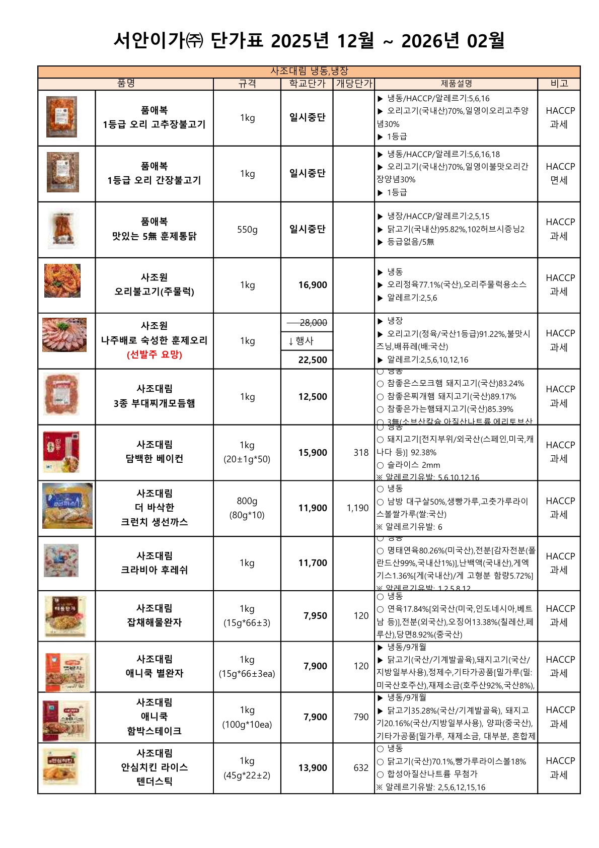 ▶▷ 서안이가 12월 (하송, 사조대림) 단가표