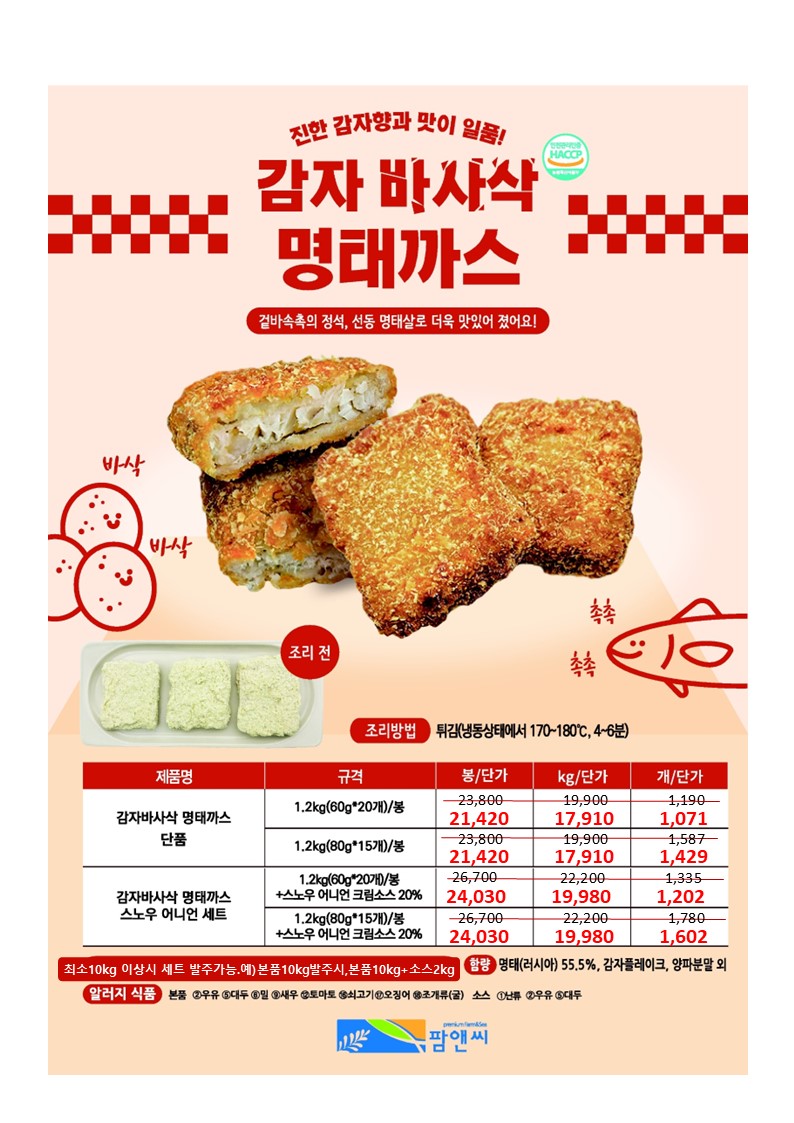 참조은~♠팜앤씨♠[2026년 1~2월 단가표](블랙타이거치즈새우,오징어로볼카츠,자숙전북다아스,붉은대게살(국내산),숯불향이븐연어스테이크,찐두부쏙새우,통살가리비볼(세트),새우짜조롤 피자토핑연어함박,명태까스,광어까스,아귀튀김,깐풍꼬다리,초당옥수수완자전,쭈구미탕탕이전,연어스테이크,한치깔라마리,감자말이새우,치즈볼,대하새우살,버터플라이적새우,블랙타이거새우, 광어살강정