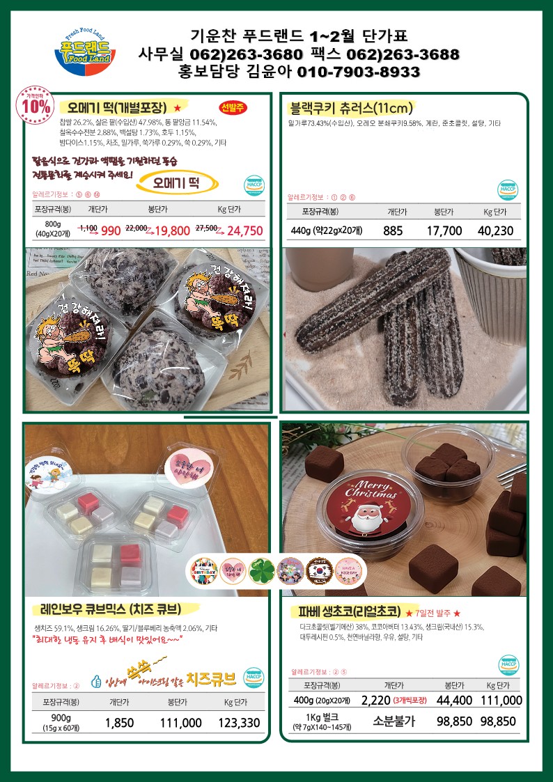 기운찬❇️푸드랜드❇️1~2월단가표 오메기떡, 레인보우치즈큐브, 파베생초코, 감말랭이, 크림치즈딸기파이등