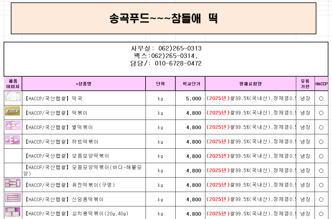 ●송곡푸드● 참들애떡 (가래떡,떡볶이 떡,떡국떡 등 ) 새학기 3월 단가표 입니다