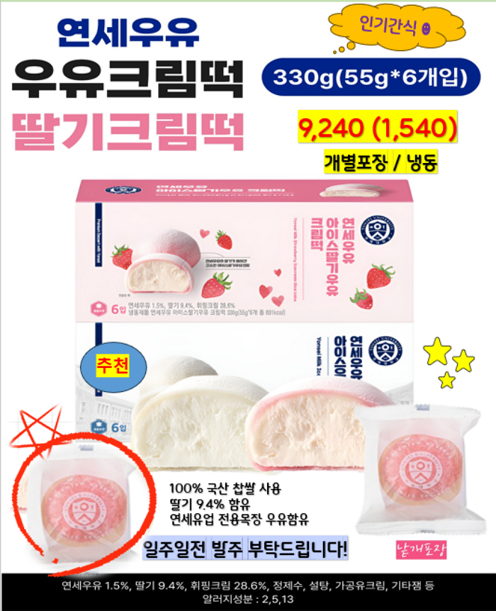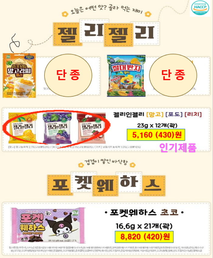 돈까스, 네모떡갈비, 김치전, 연세우유크림떡, 창억떡, 호떡, 붕어빵, 쌀찐빵, 케익, 스모어쿠키,