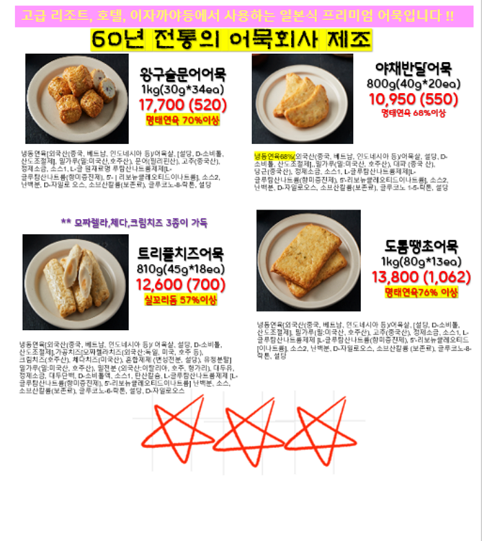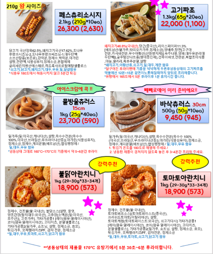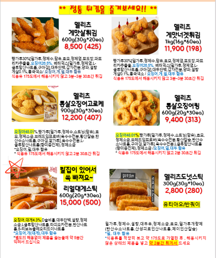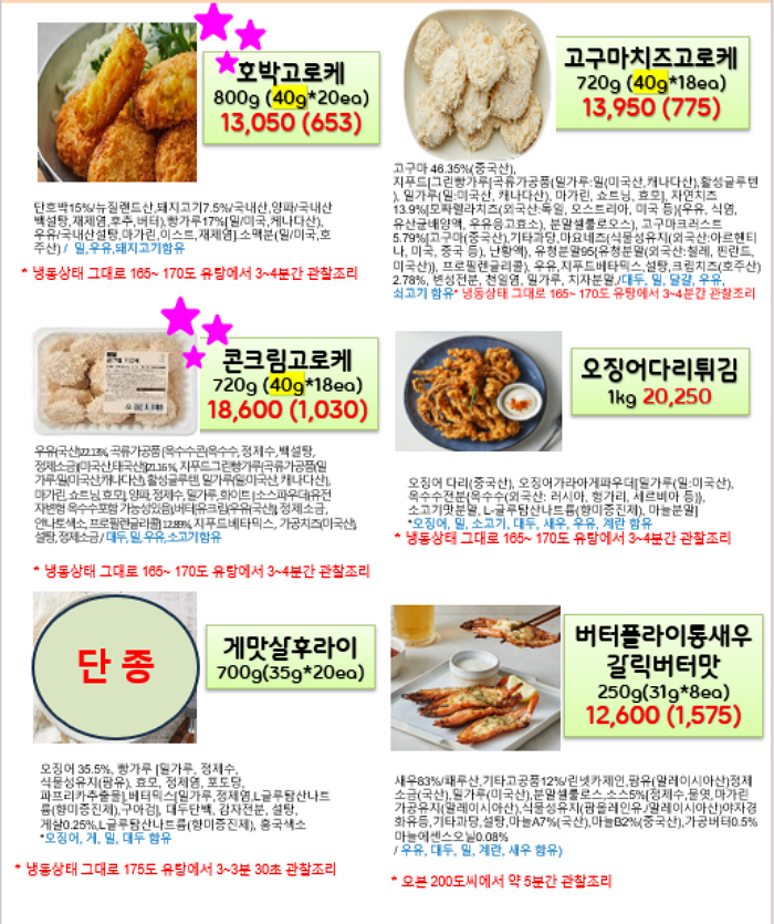 * 고로케, 어묵, 피자, 감자채전, 오징어링, 오징어너겟, 유부당면주머니,,,