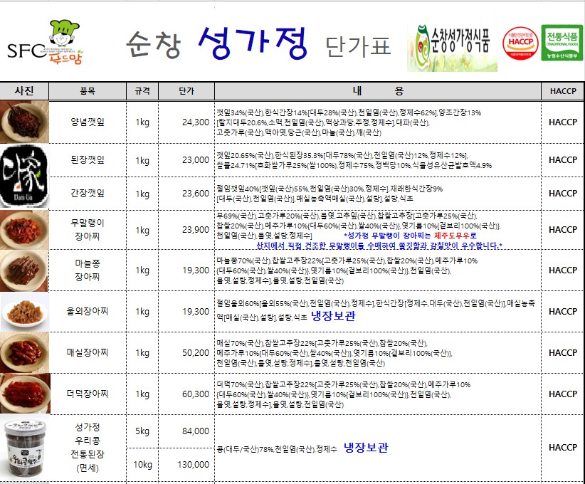 ***SFC푸드맘 순창 "성가정" 3월 단가표입니다(장아찌류,NON GMO 전통장류HACCP인증)***
