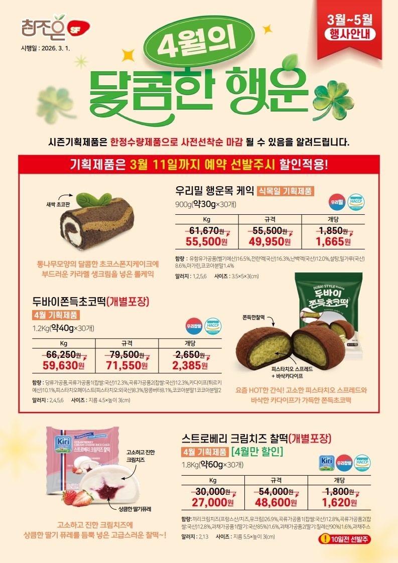 ♠참조은♠[2026년 식목일기획선발주할인,블랙데이기획품] -우리밀행운목케익,두바이쫀득초코떡-3월11일 선발주할인,스트로베리크림치즈찰떡등