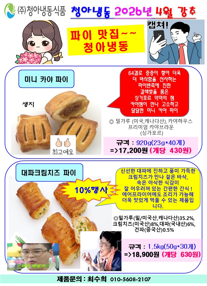 ★☆ 도래샘푸드===>>❤️❤️♠청아냉동 (26년4월) 단가표 ♠❤️❤️크랜베리스콘,사브레쿠키,대파크림치즈파이,볶음김치왕만두,파인애플팬케익,씨앗품은호떡파이,링에스도넛,블루베리파운드,초코머핀,매콤고추잡채만두,갈릭파이