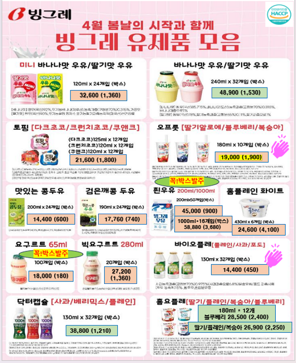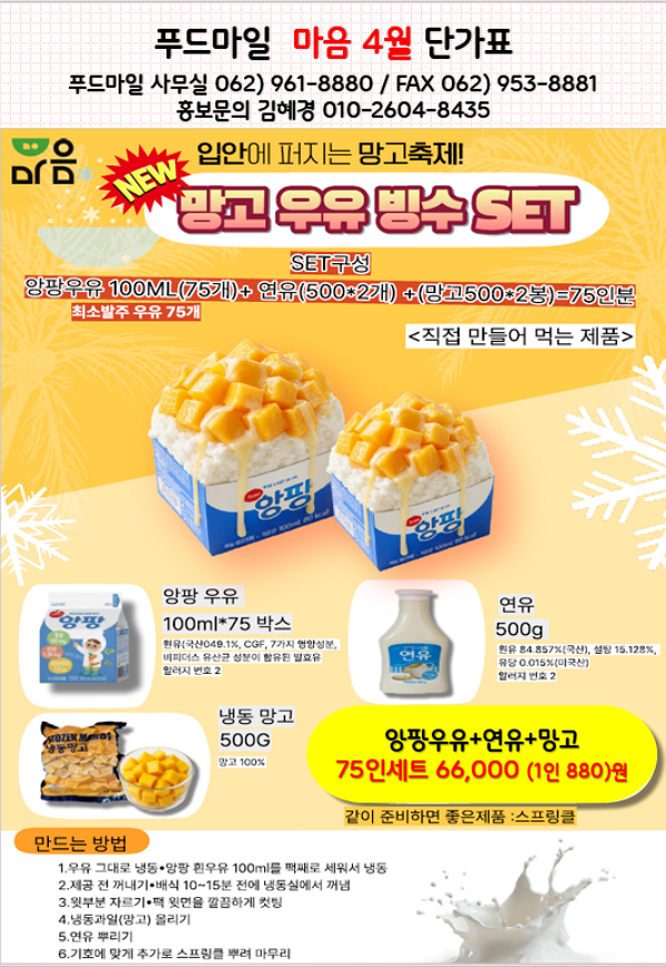 ♥♥♥ 푸드마일 마음 4월 단가표 입니다 ♥♥♥ 서울우유, 망고우유빙수세트, 남양유업, 강동오케익, 앙버터호두과자, 연세우유크림떡, 연세우유크림팝콘, 에그타르트, 마들렌, 딸기삼각케익, 두바이피스타치오초코바, 샌드위치, 창억떡, 수제스모어쿠키, 젤리, 차슈, 동파육, 돼지고기참나무캠핑꼬치구이, 돈마호크, 채접살, 전복솥밥, 홍삼전복, 오리불고기,