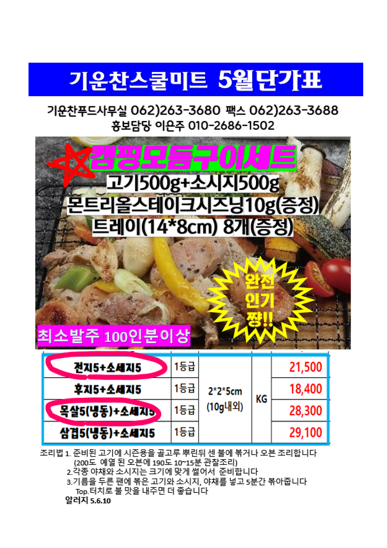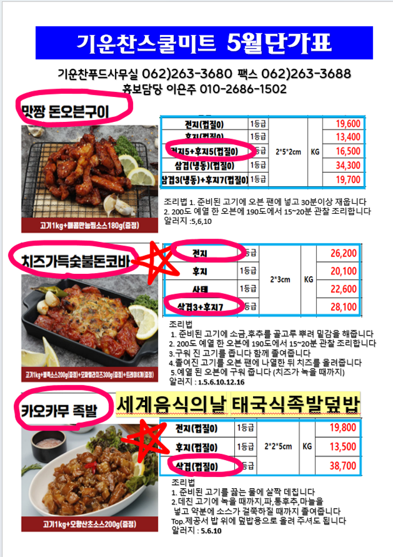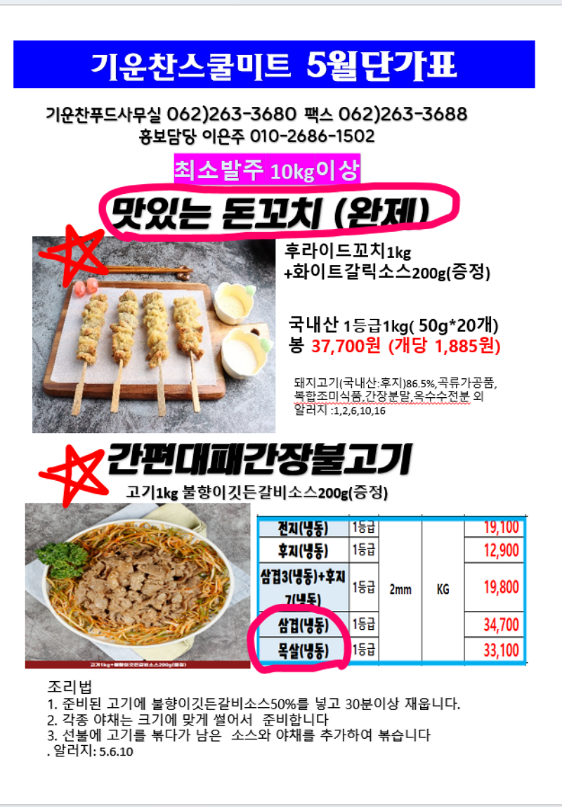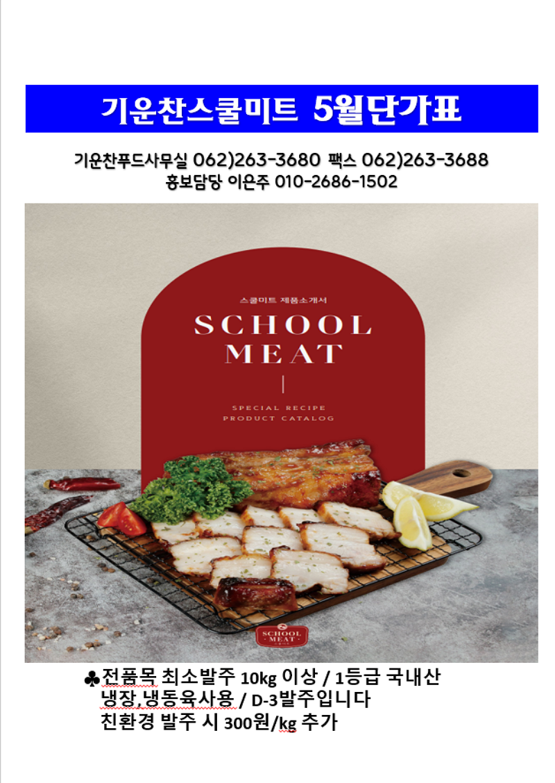 ♣♣기운찬스쿨미트 25년 5월 단가표입니다♣♣캠핑구이세트,카오카무족발,바베큐타코,돈등갈비탕,맛있는돈꼬치,맛나소불고기,칼집목살스