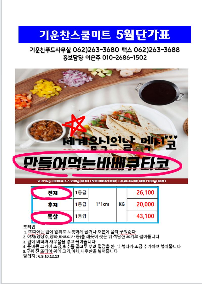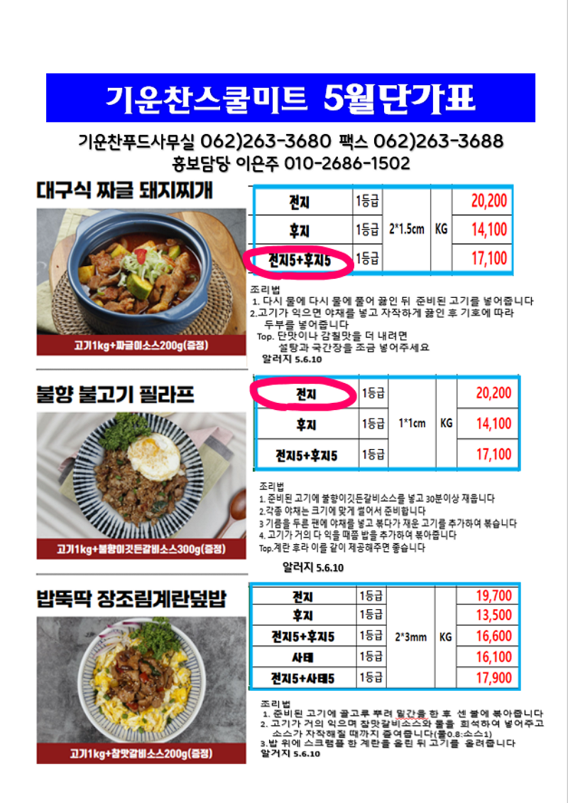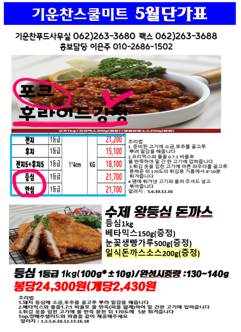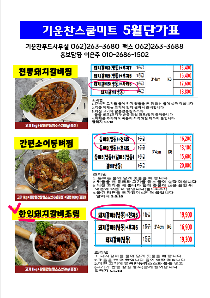 ♣♣기운찬스쿨미트 25년 5월 단가표입니다♣♣캠핑구이세트,카오카무족발,바베큐타코,돈등갈비탕,맛있는돈꼬치,맛나소불고기,칼집목살스