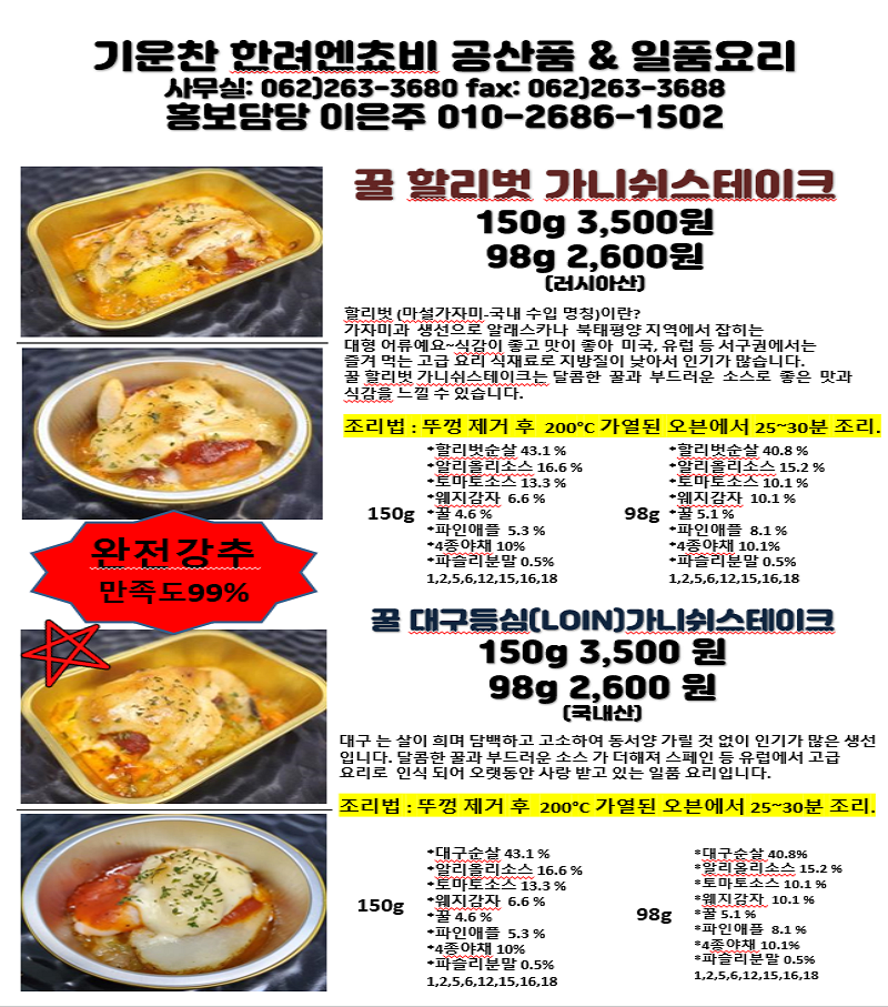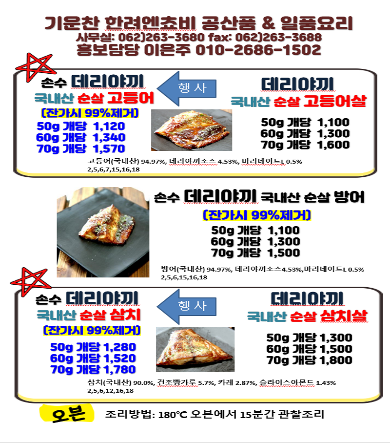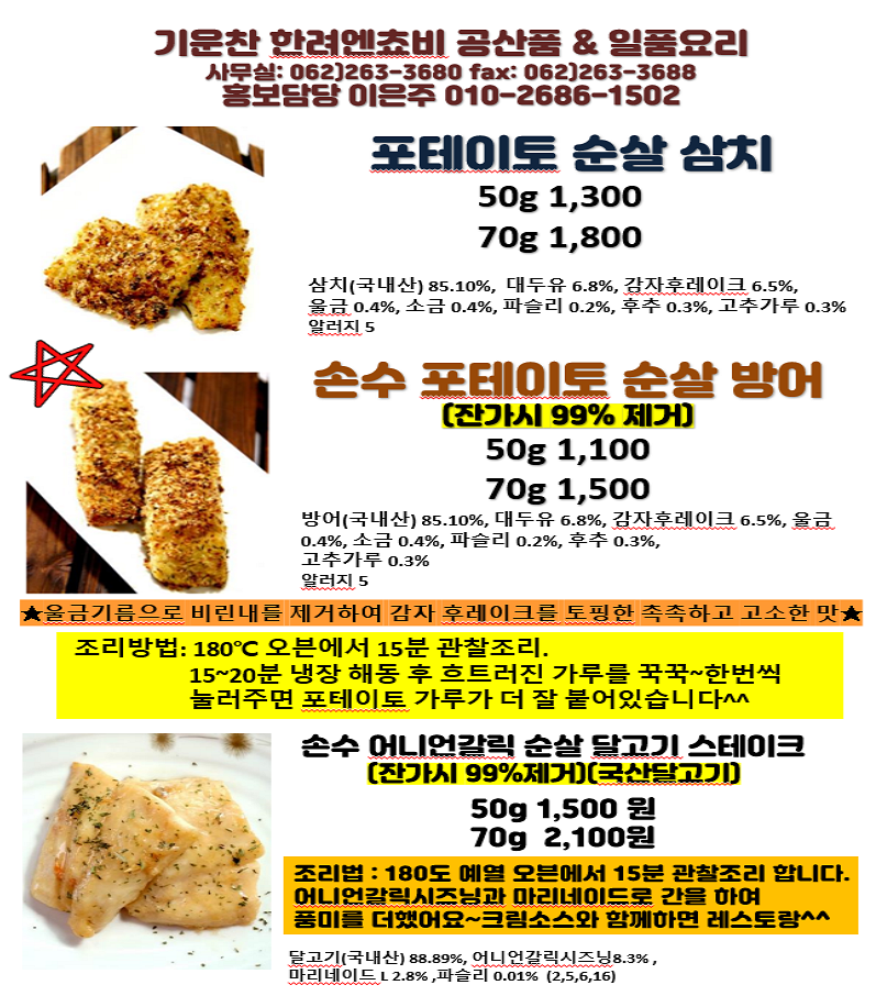 ※※※ 기운찬 한려엔쵸비 5월 단가표입니다 ※※※ 포테이토순살고등어,순살삼치,블랙타이거새우,참돔순살스테이크,