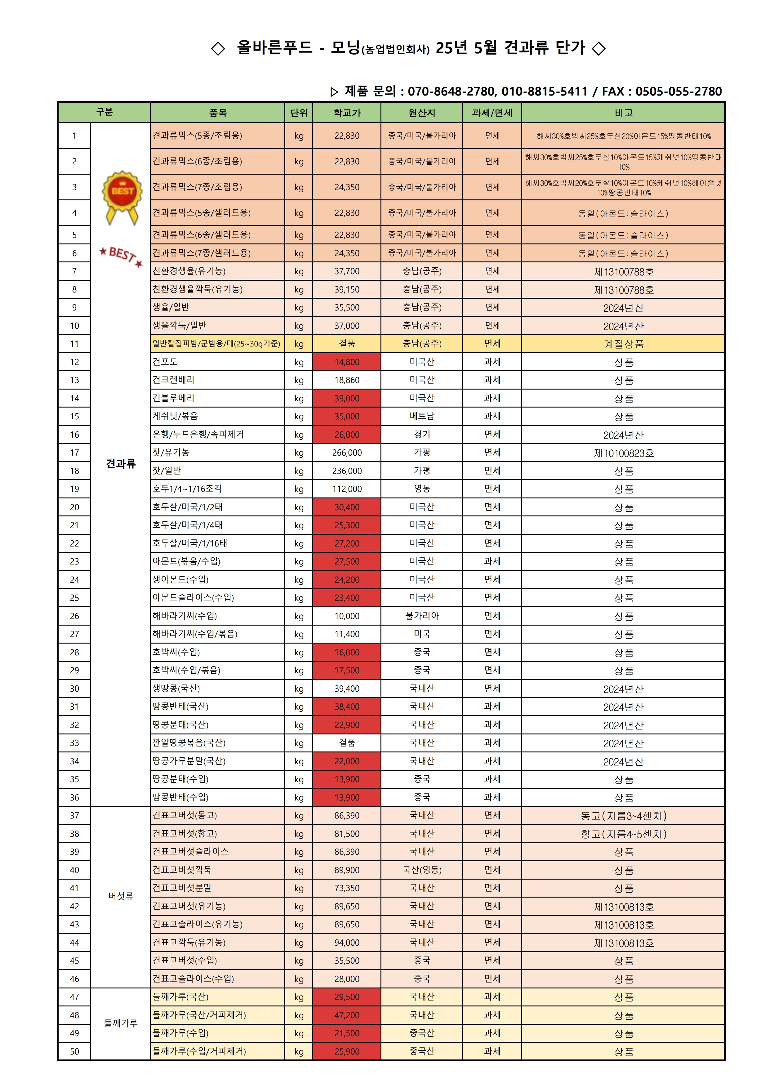 《올바른푸드》♣♣모닝-견과류 25년 5월 단가표(단가 인상)♣♣ (견과류믹스,호두살,아몬드,캐쉬넛,잦,땅콩,들깨가루…