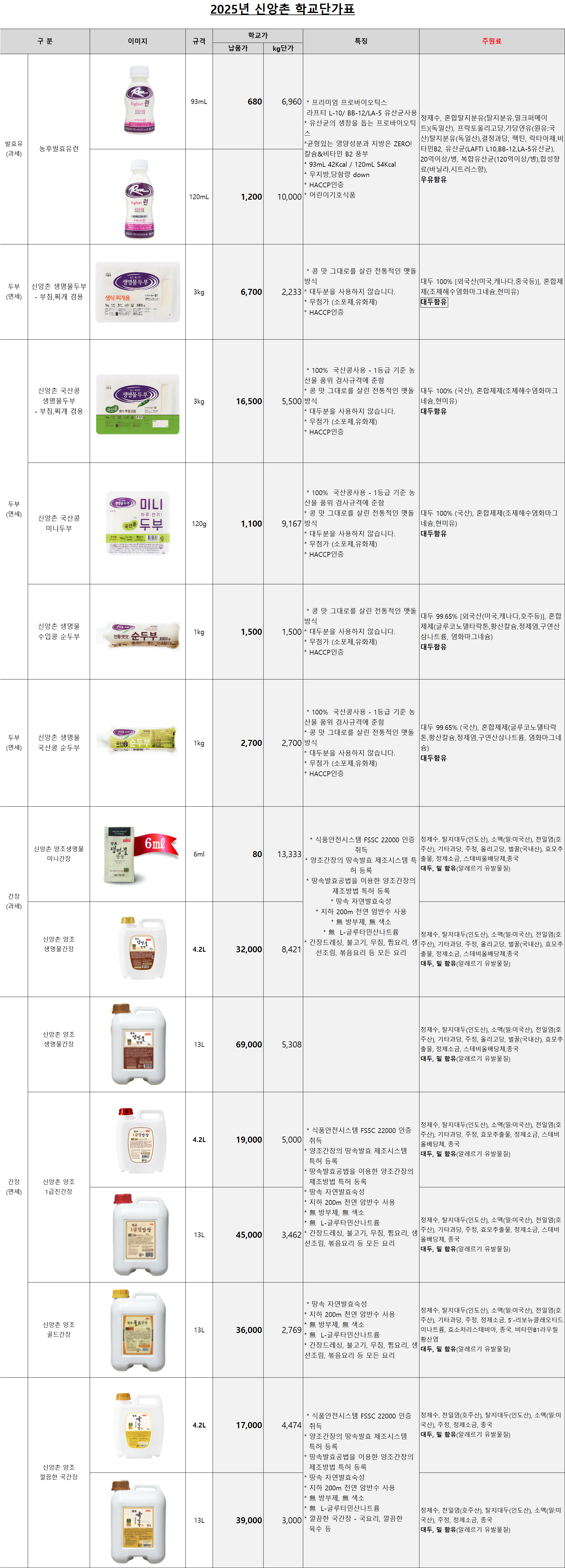 2025년 신앙촌 식품 급식 단가표 입니다!
