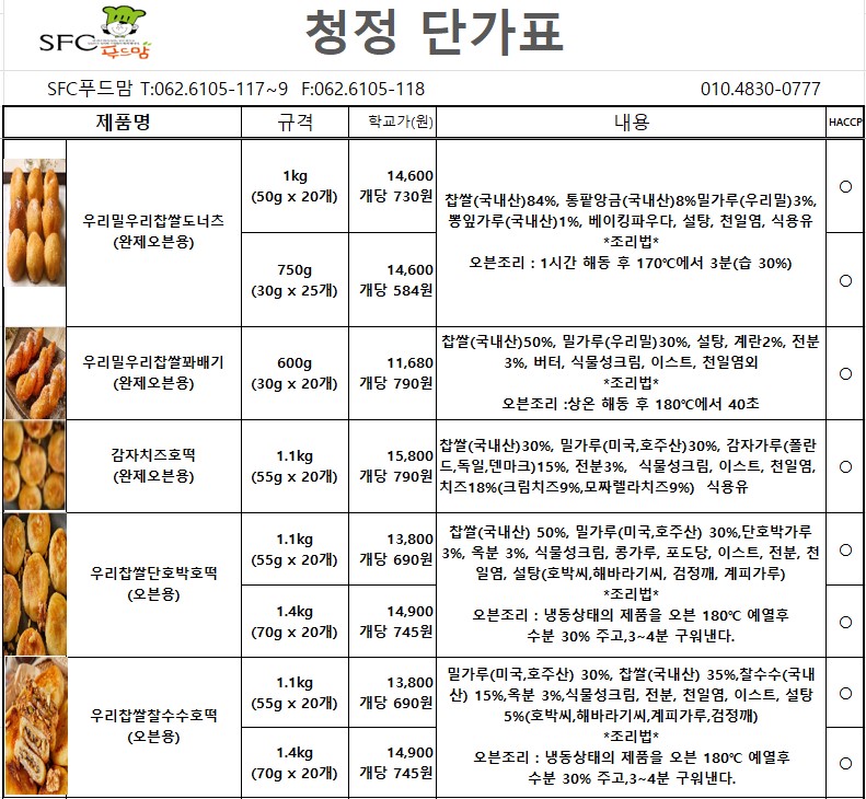 ***SFC푸드맘 청정(음료,오븐용 도넛류,영광굴비,고춧가루,유기농 설탕...) 1학기 단가표입니다.***