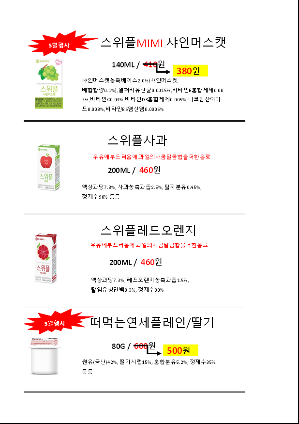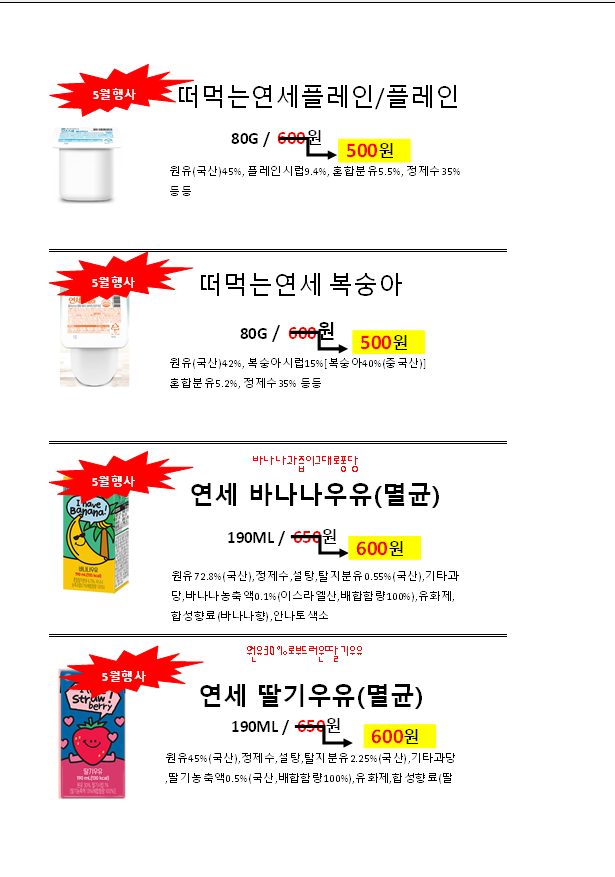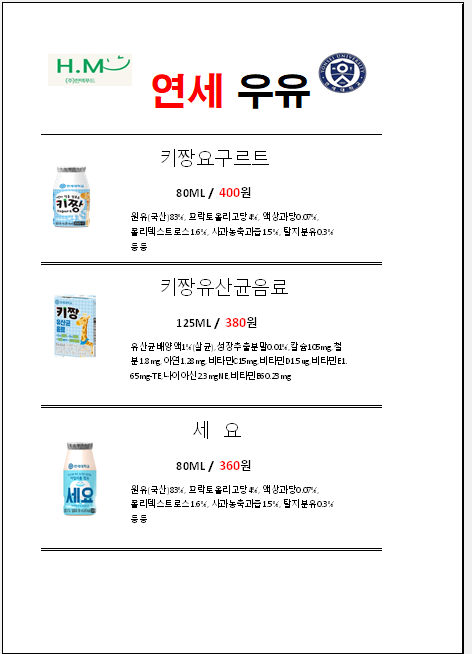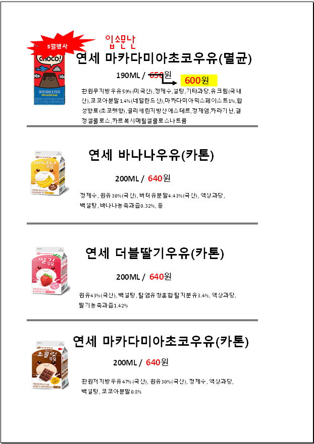 ◈◈한맥푸드◈◈ 연세 우유 6월 단가입니다◈◈◈