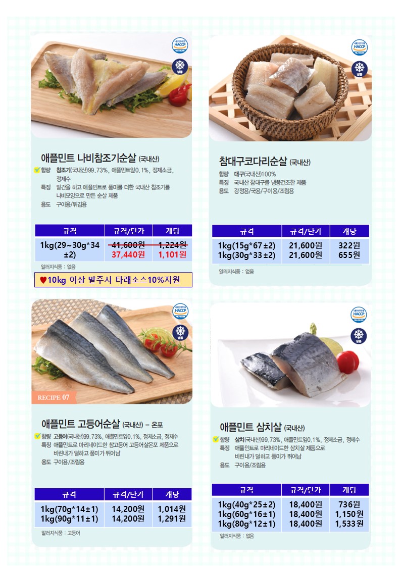 참조은~♠팜앤씨♠[2025년 6월 단가표](달고기프라이드피쉬,명태까스,광어까스,바다장어튀김,아귀튀김,깐풍꼬다리,초당옥수수완자전, 쭈구미탕탕이전,연어스테이크,통살새우꼬지,감자말이새우,치즈볼,대하새우살,버터플라이적새우,블랙타이거새우, 광어살강정세트,해물탕,소라쭈구미채,오징어링튀김등)