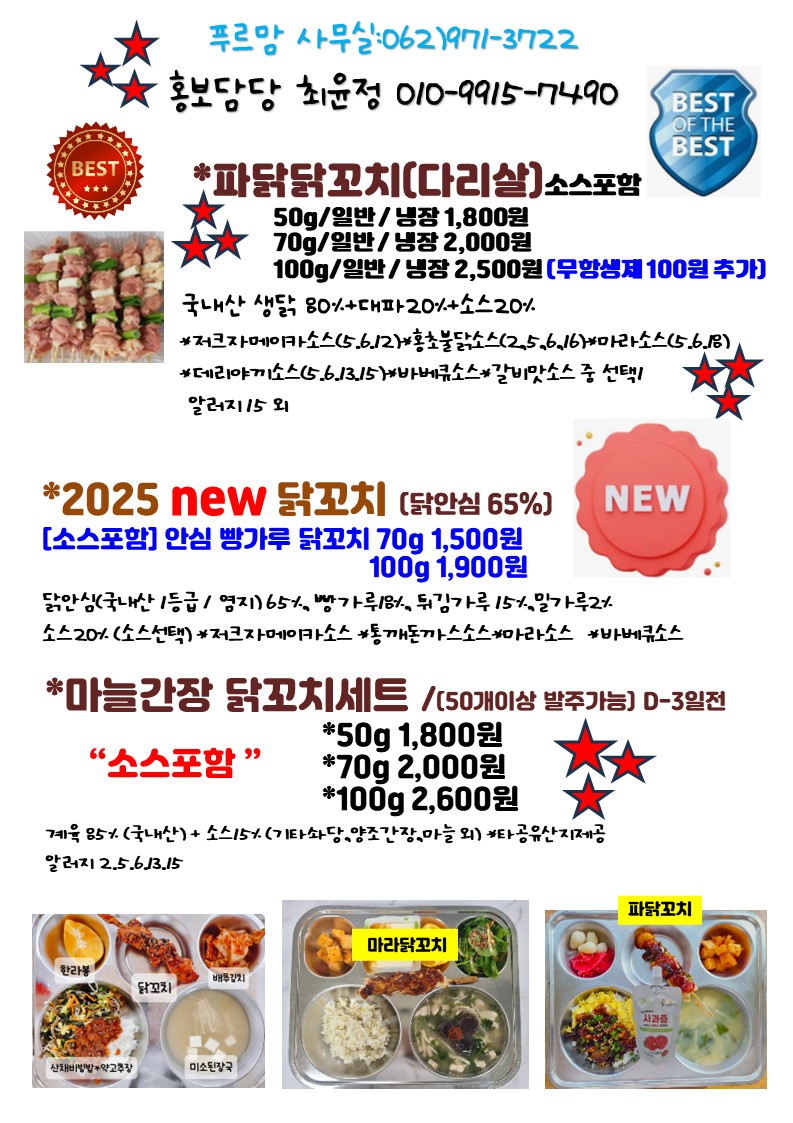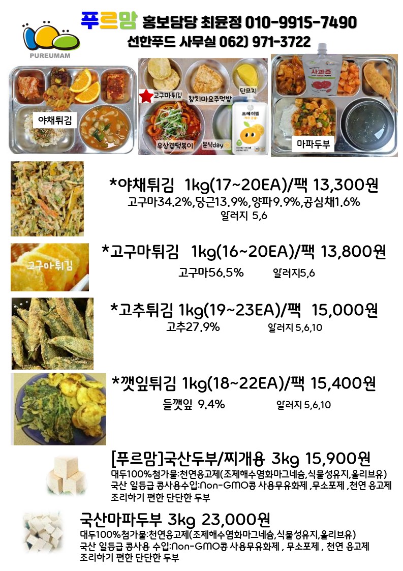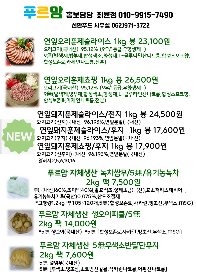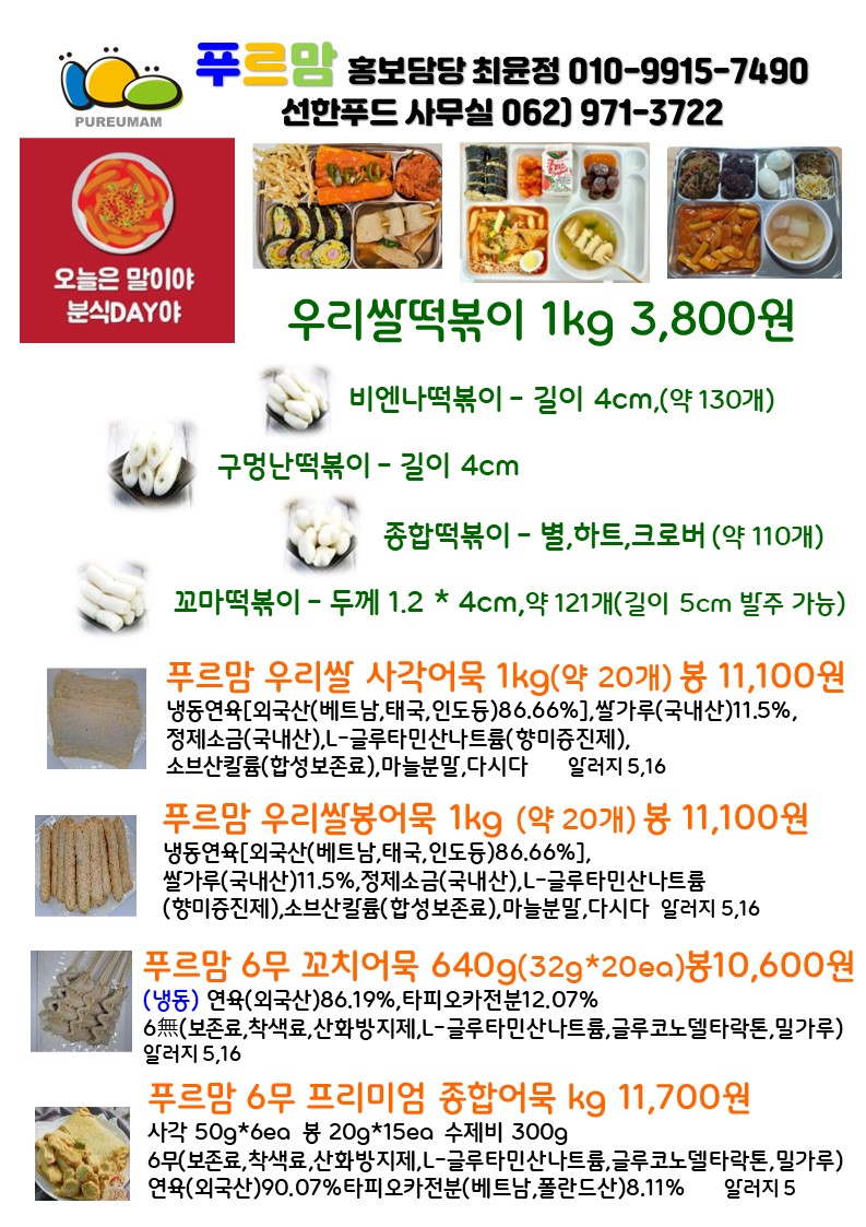 푸르맘 6월 단가표^^고맙습니다.소시지패스츄리,우리밀버거,영덕대게살볶음밥,하노이베트남쌀국수,들기름메밀막국수,투움바크림소스,페투치네,스파게티,떡볶이,레몬퐁당눈꽃꿔바로우,쿵푸마라치킨,블랙알리오치킨,홍초불닭,숯불바베큐굽닭,수원왕갈비치킨,덮밥,닭꼬치,돼지훈제슬라이스,쌈무,피클,오리훈제쵸핑,피자,돼지갈비,떡꼬치,몽블랑,우유생크림빵,멘보샤,통새우짜조롤,크런치링,찹쌀볼