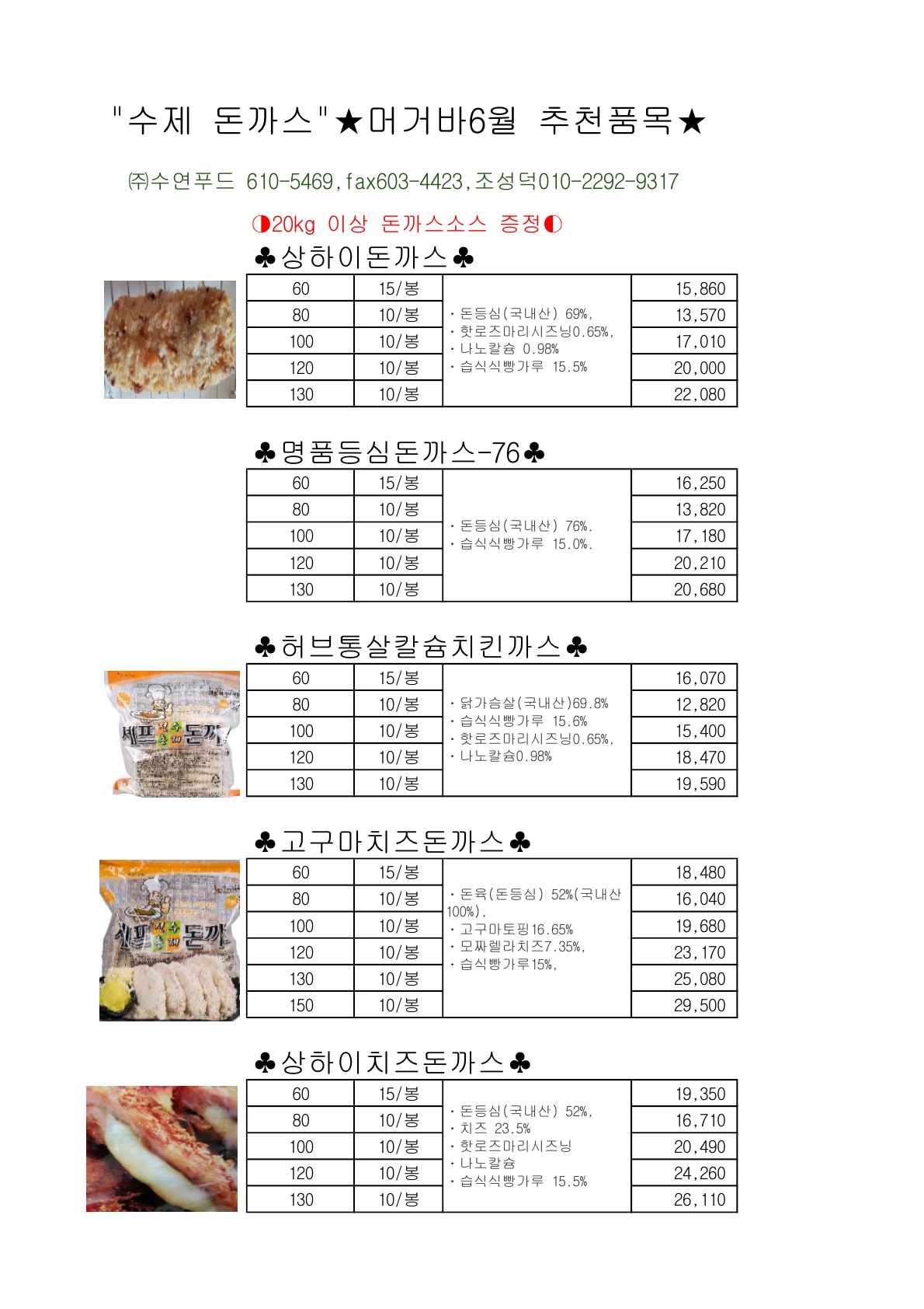 ▶수연푸드▶100%국내산 돈육으로 만든 수제돈까스전문"머거바"25년6월(등심돈까스,볼록볼치즈돈까스,고구마치즈돈까스,상하이돈까스,통살허브치킨까스,겹겹이돈까스등)단가입니다.