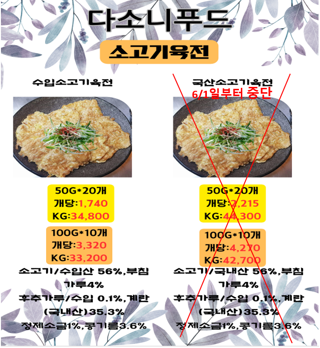 다소니 푸드 제품인 국산 소고기 육전이 6월 1일 부터 중단됨을 알려드립니다