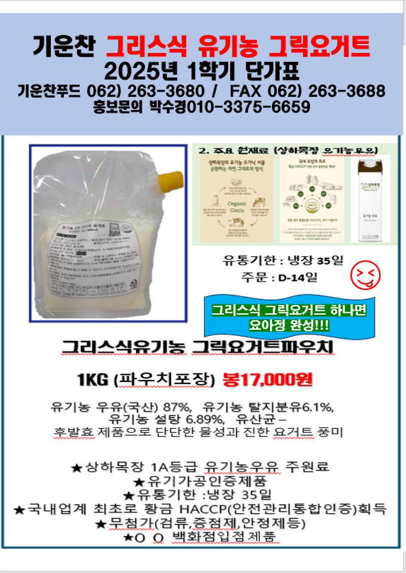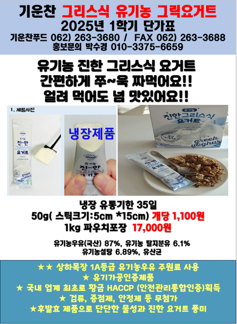 ♣ 기운찬 유기농 그리스식 그릭요거트 4월 단가표입니다. ♣황금HACCP,무첨가,유기가공인증제품 그릭요거트개별포장,벌크