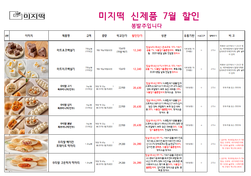 ◈◈한맥푸드◈◈ 미지푸드(꽃떡국,하트떡국,꽈배기떡볶이) 7월단가입니다◈◈◈