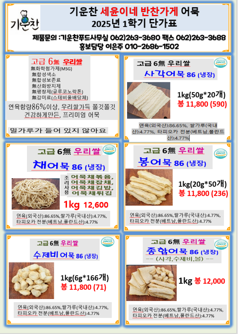 고급채어묵, 고급6무 사각어묵, 꽈배기어묵, 봉어묵, 수제비어묵,종합어묵, 사각꼬지어묵, 길쭉잡채말이어묵, 사각어묵, ,,,