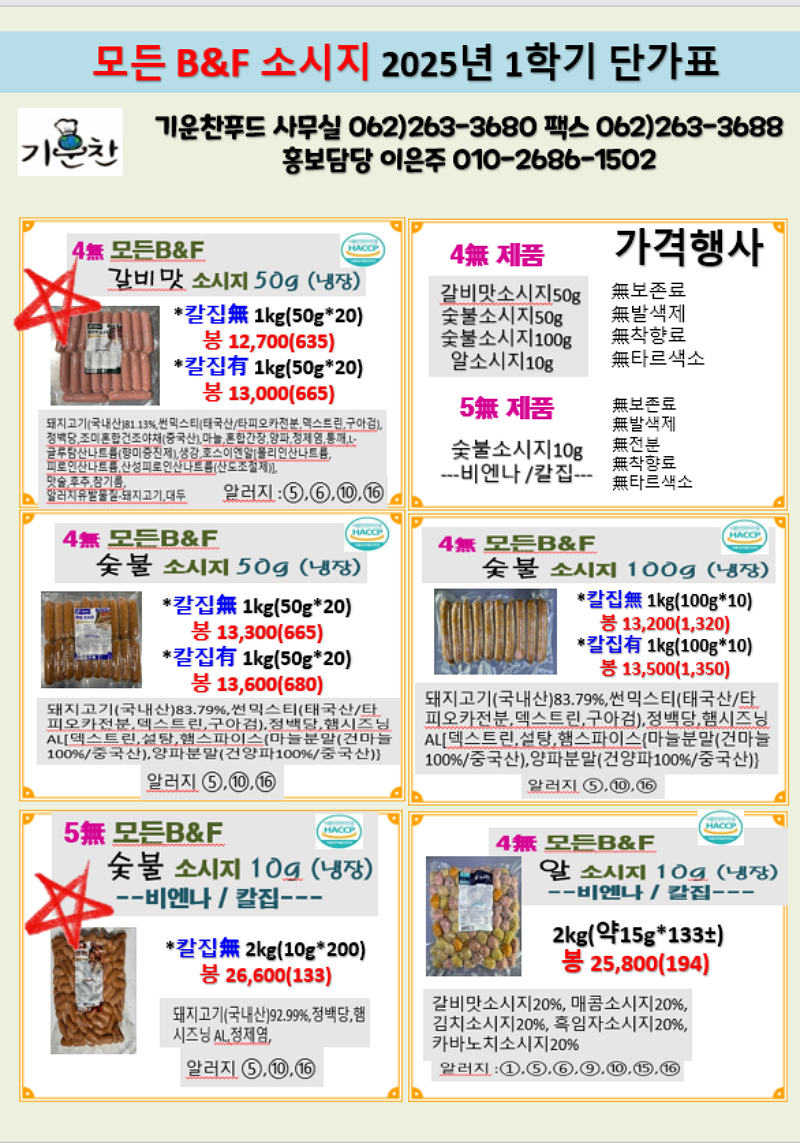 ♣♣♣ 기운찬 모든 B&F소시지 세윤이네어묵 4월 단가표입니다. ♣♣♣ 고급채어묵, 고급6무 사각어묵, 꽈배기어묵, 봉어묵, 수제비어묵,종합어묵…