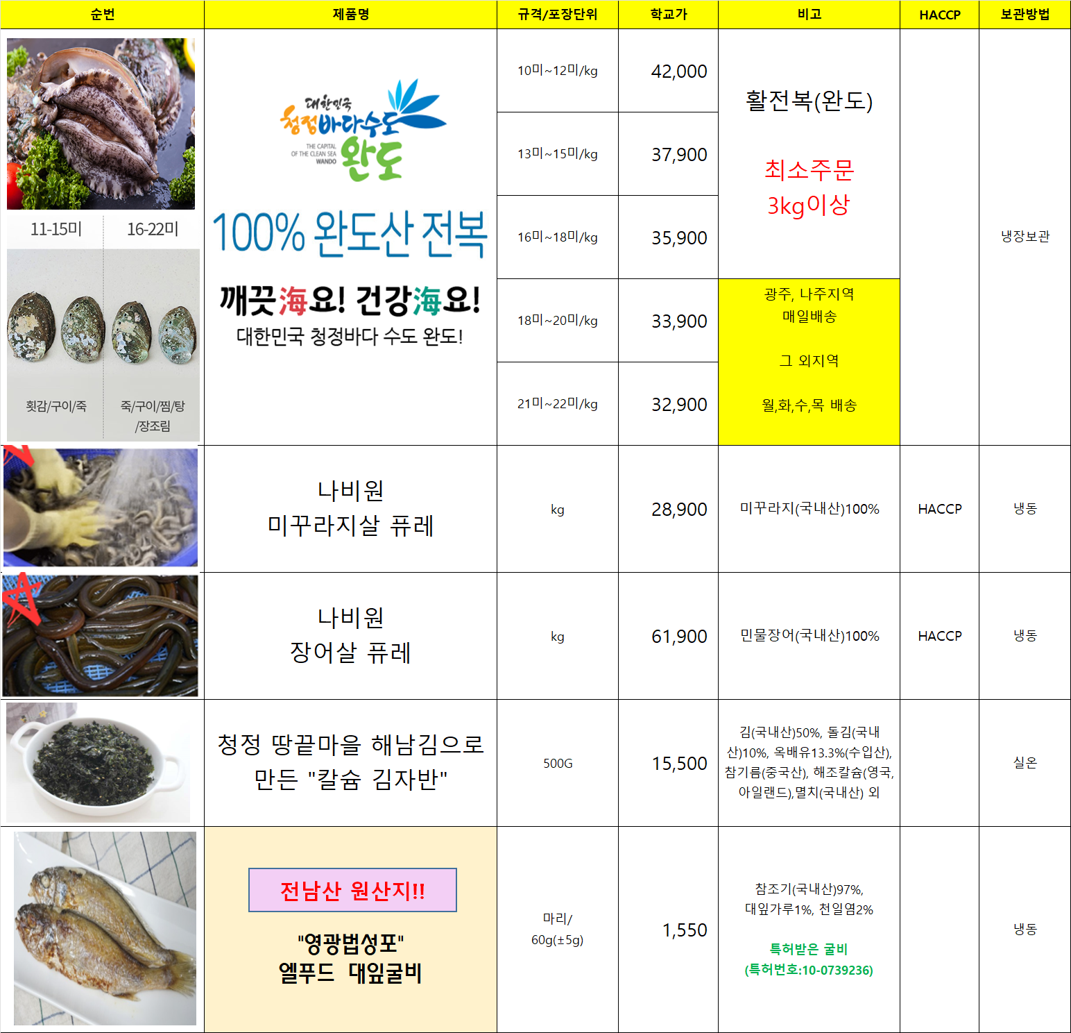 ♥♥♥ 엘푸드대표수산물 07월~08월 ▶완도활전복, 대잎굴비, 미꾸라지살퓨레, 장어살퓨레, 칼슘김자반 학교단가표 ♥♥