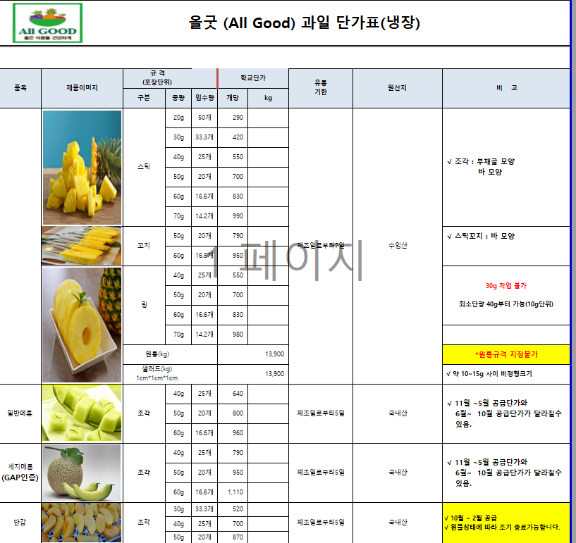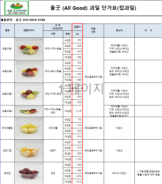 ♥♥한맥푸드♥♥ 올굿 (이루다-과일) 8월 단가표입니다^^