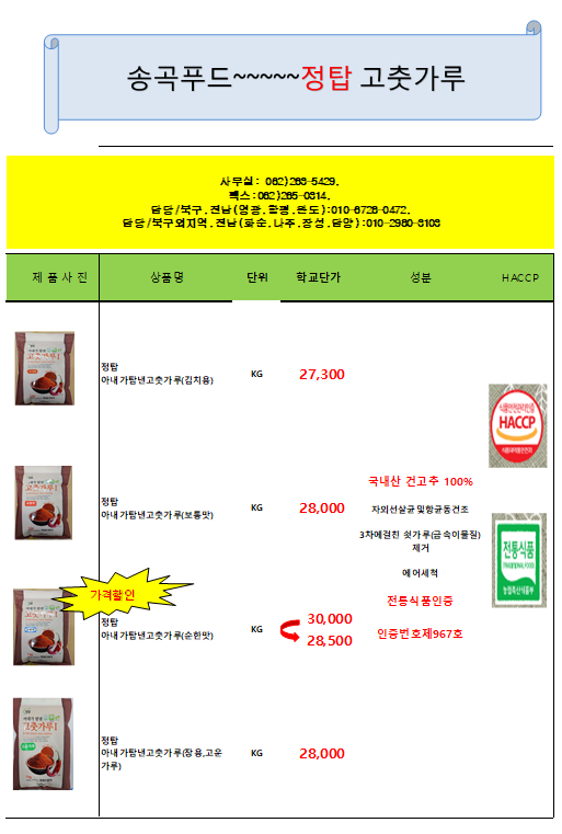 ◐◐(주) 송곡푸드◑◑ 정탑(전통식품인증) 고춧가루 8월 단가표 입니다^^