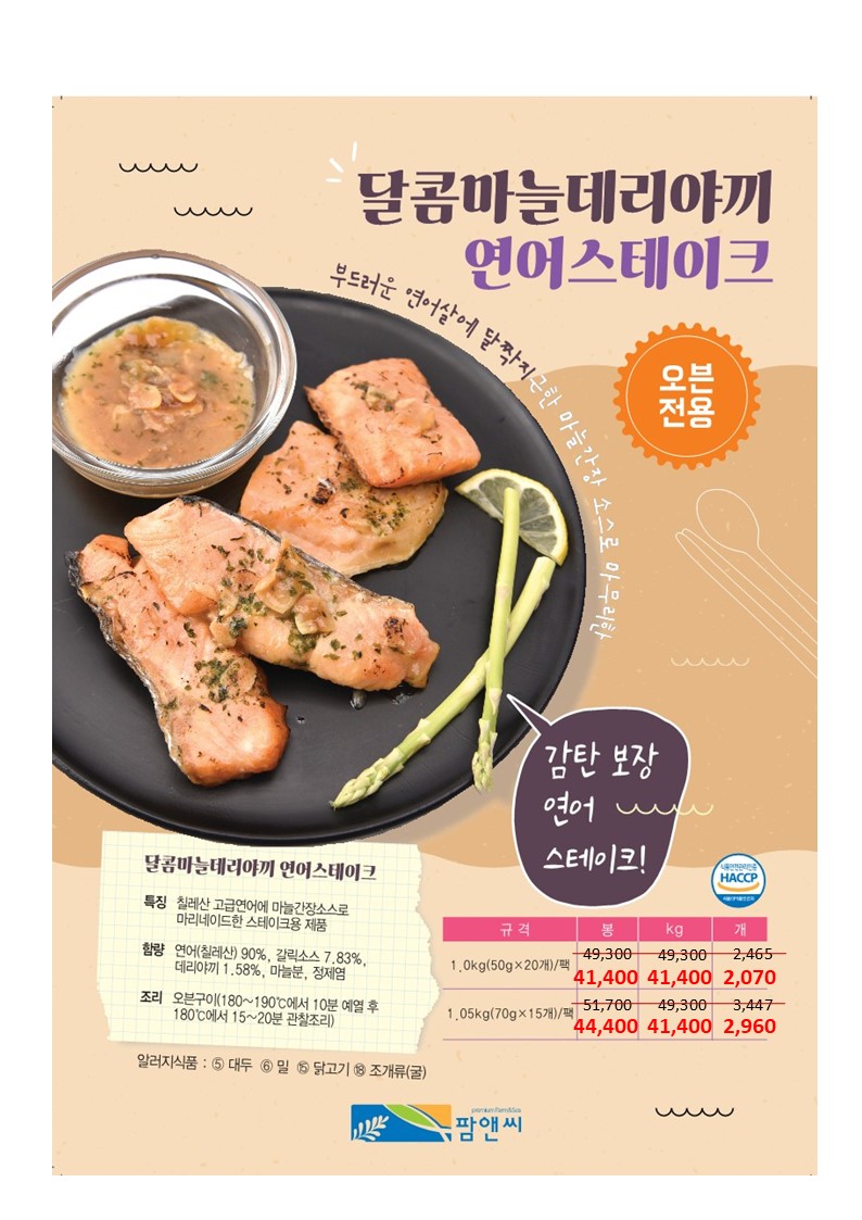 ◆ 할인제품 : 피자토핑연어함박,쭈꾸미탕탕이전,초당옥수수완자전,한치깔라마리,국내산대하새우살,어부의선택해물탕세트,달콤마늘데리아끼연어스테이크,맵달소라쭈꾸미채,