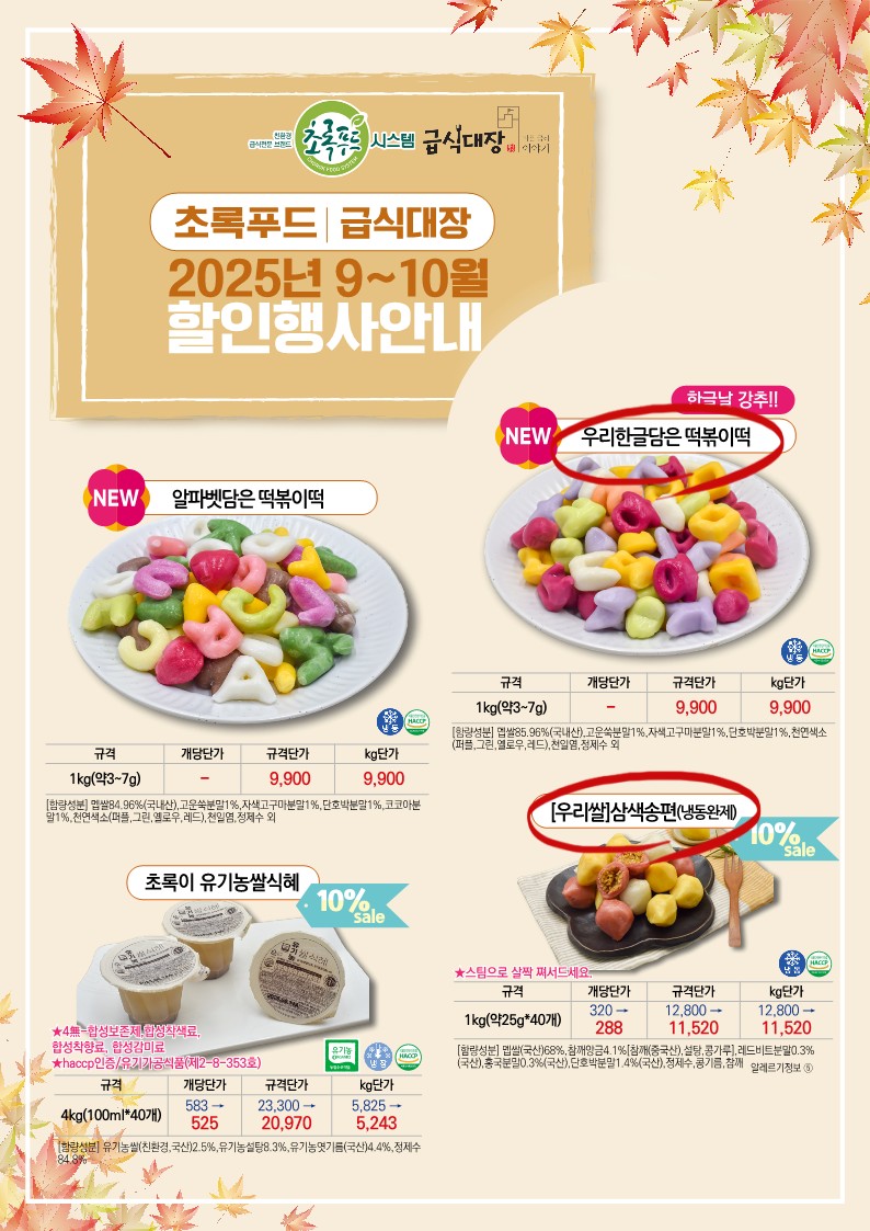 ✿✿[동원에프엔에프]초록푸드&급식대장 9월 단가표✿✿