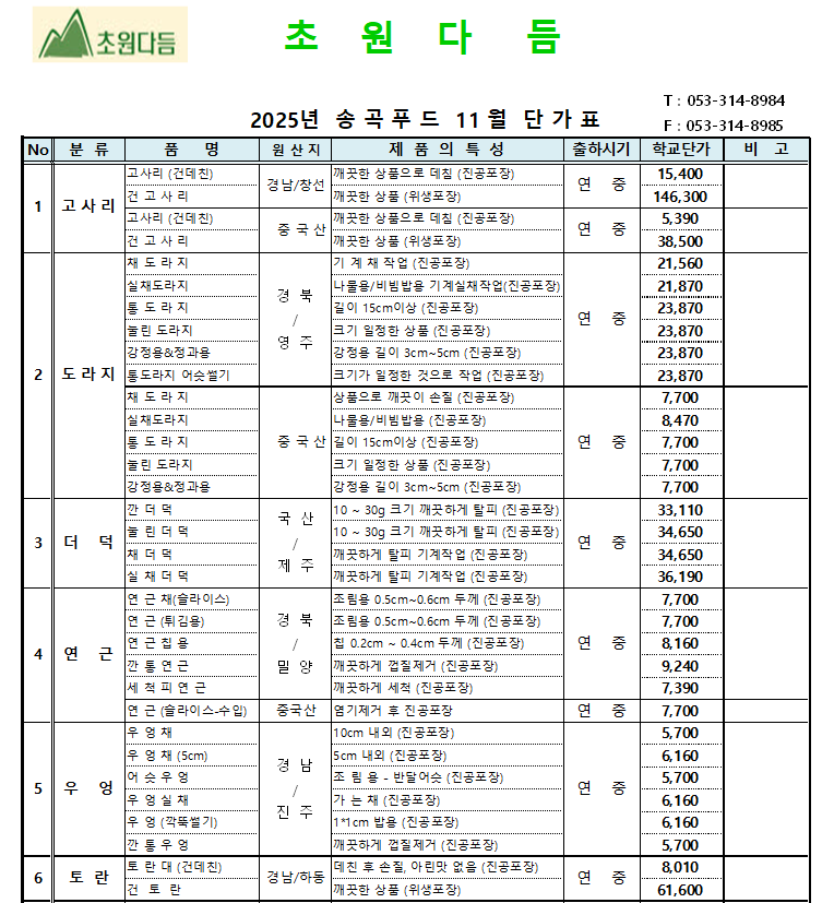 ◈◈한맥푸드◈◈ 초원다듬 (나물, 마늘,생강 )11월 단가표입니다