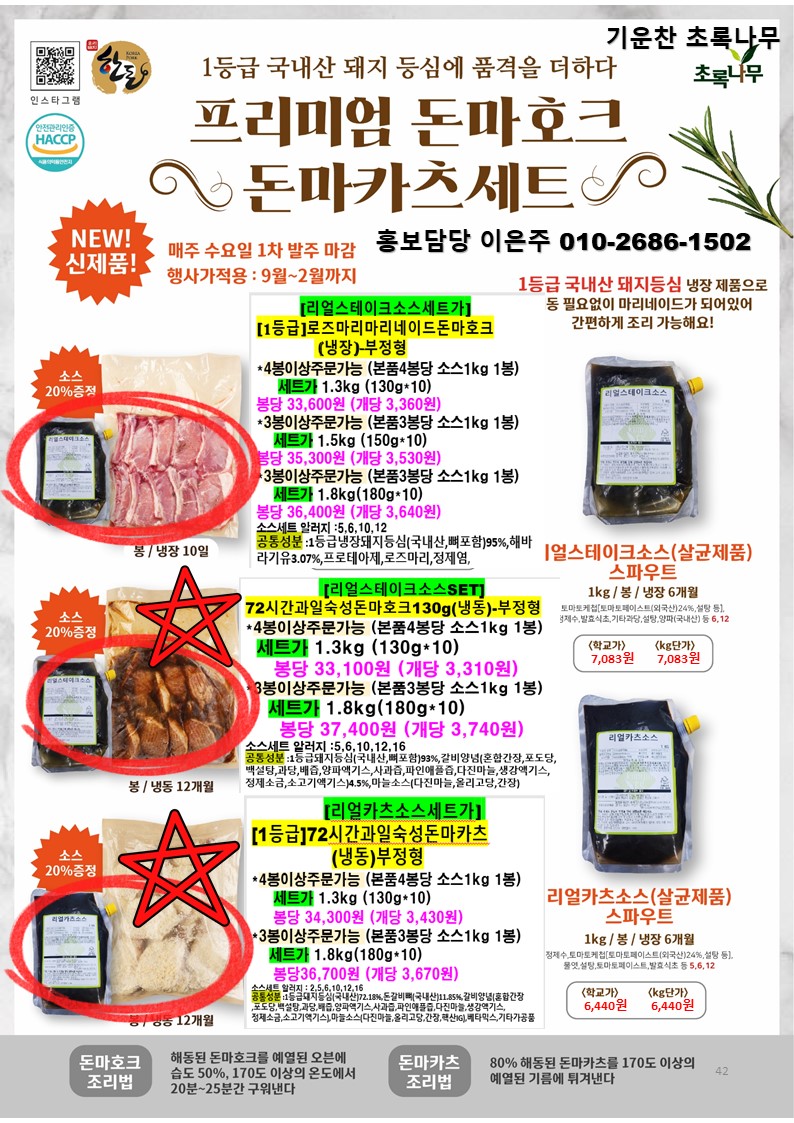 기운찬❤️초록나무12월❤️프리미엄돈마호크, 등심탕수육, 수제돈까스, 한우수제떡갈비,연잎떡갈비, 무항생제돈육떡갈비,모듬햄등