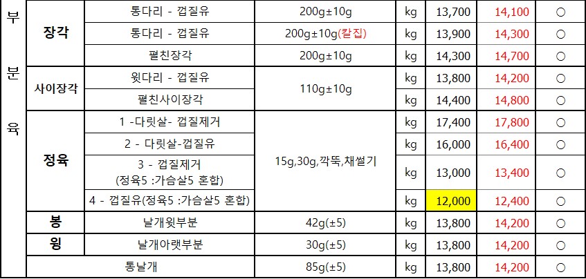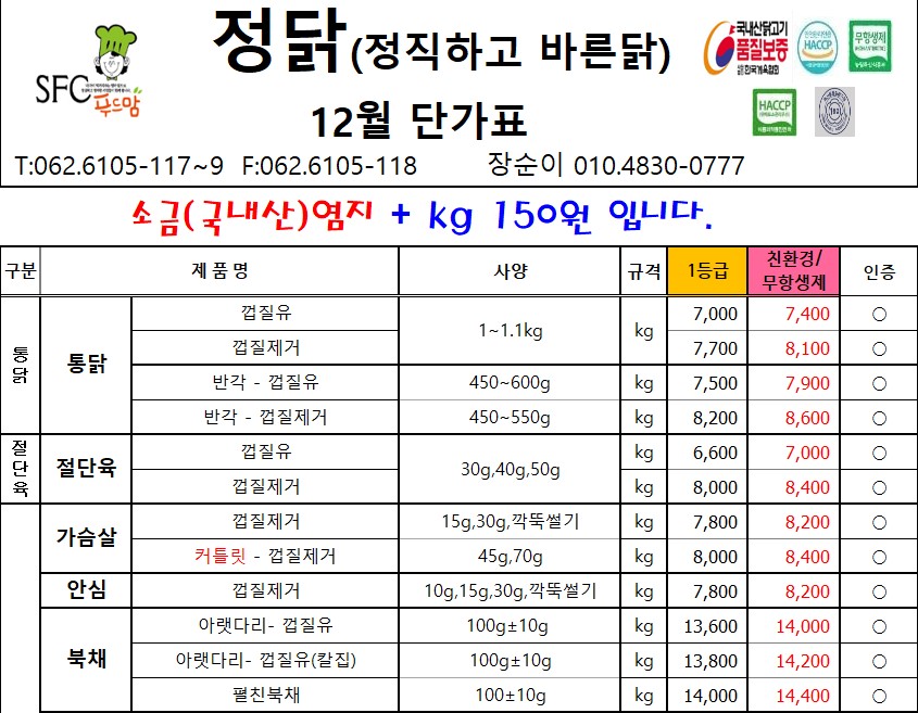 **SFC푸드맘 정닭(정직하고 바른닭) 12월 단가표입니다**