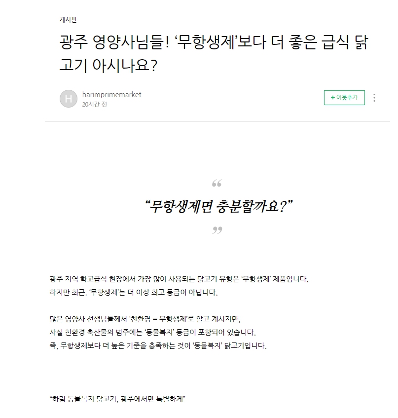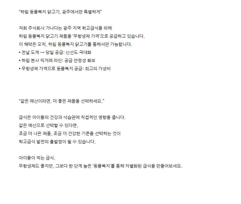 전남권학교급식 담당하시는 선생님 안녕하세요? 혹시 무항생제보다 더 좋은 급식 닭고기를 아시나요?