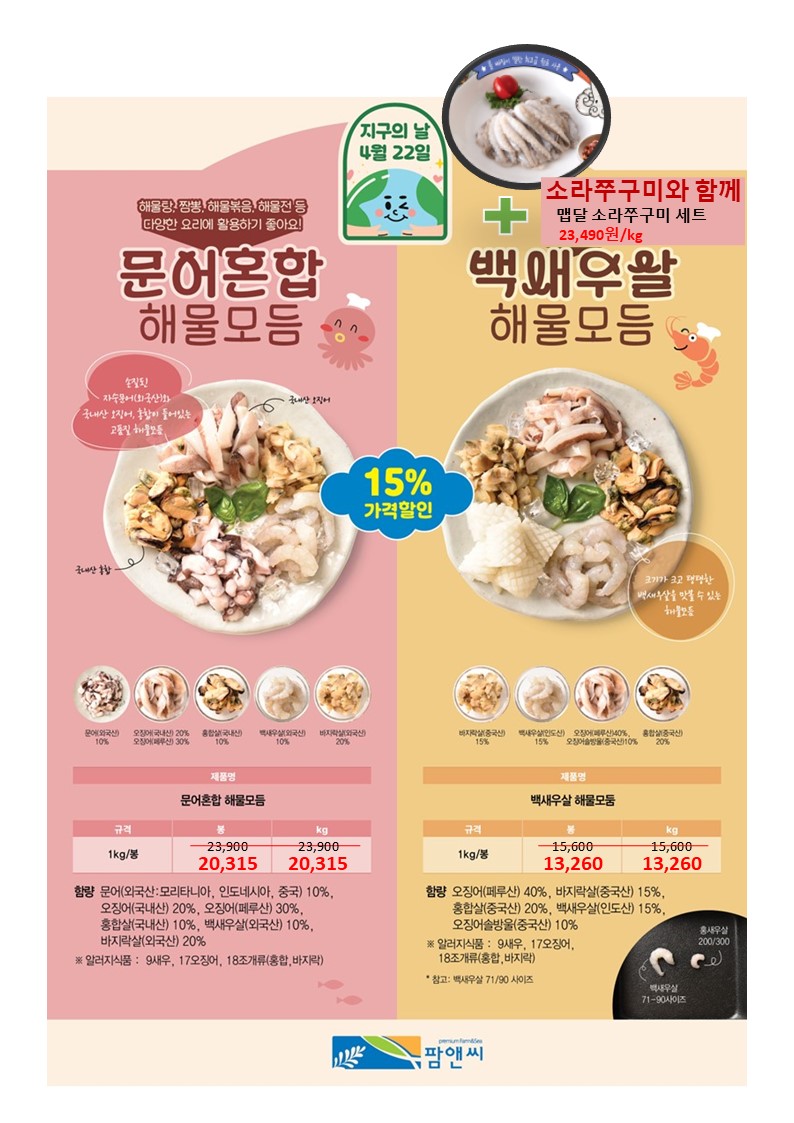 참조은~♠팜앤씨♠[2026년3월 단가표](만들어먹는 수제광어생선까스,감자바사삭통오징어링튀김,어부의선택순살동태알탕, 올리버페퍼연어스테이크 스노우어니언크림세트,애플민트참조기굴비,문어혼합해물모둠, 백새우살해물모둠,국내산대하새우살,만들어먹는국내산대하새우살레몬크림세트,전남산특삼치포, 자숙전복다이스,감자바사삭명태까스,숯불향이븐연어스테이크,맵달소라쭈꾸미세트,바사삭순살깐