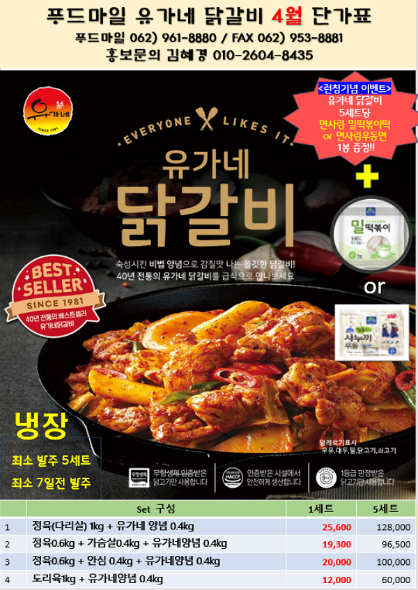 ♥♥♥ 푸드마일 유가네닭갈비 4월 단가표 입니다 ♥♥♥