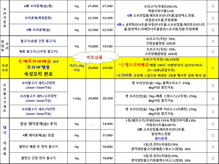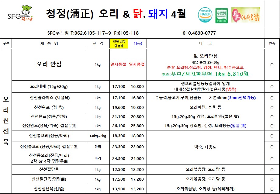 *SFC푸드맘 청정오리 4월 단가표입니다*