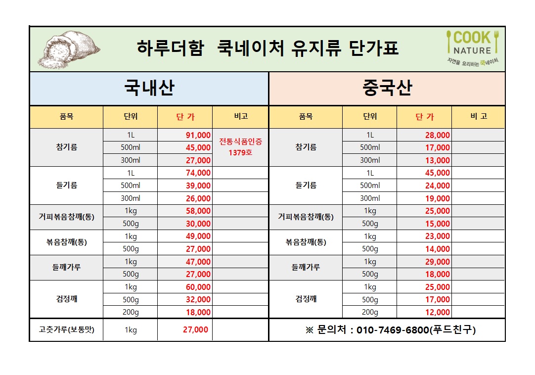 - (푸드친구)하루더함 쿡네이처 참기름,참깨 단가표.xlsx [size : 37.6 KB] [다운로드 : 2]