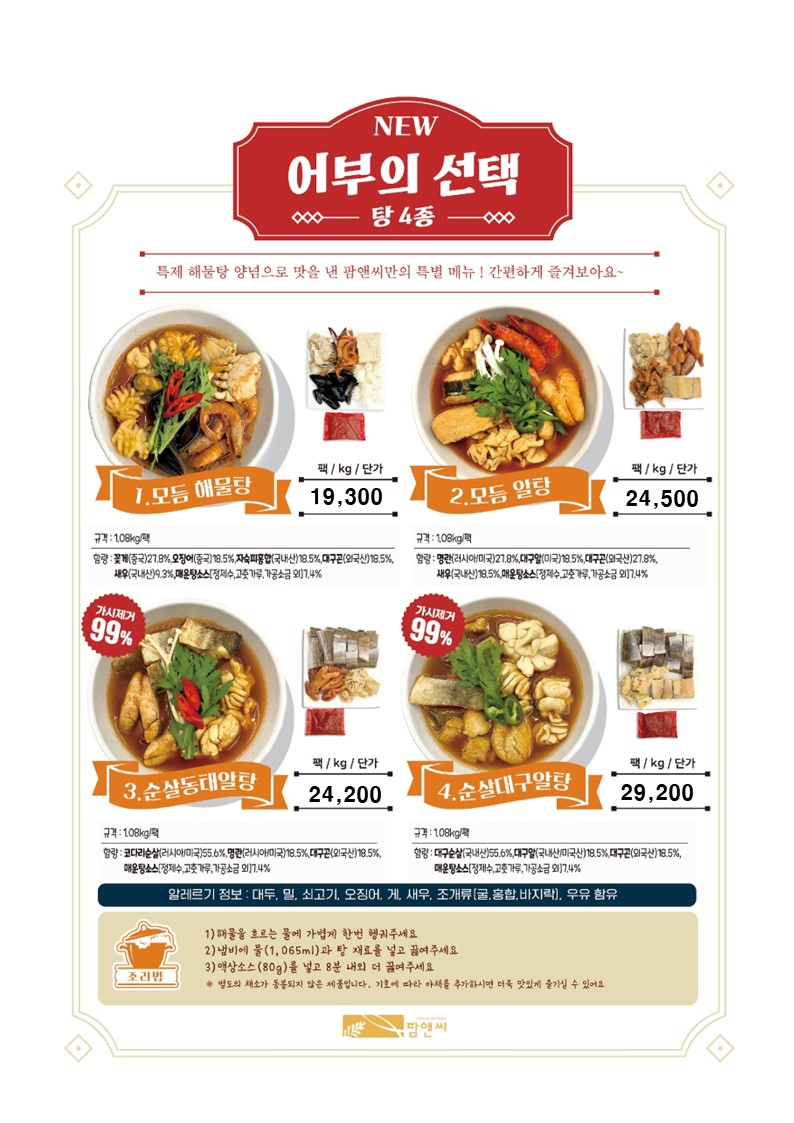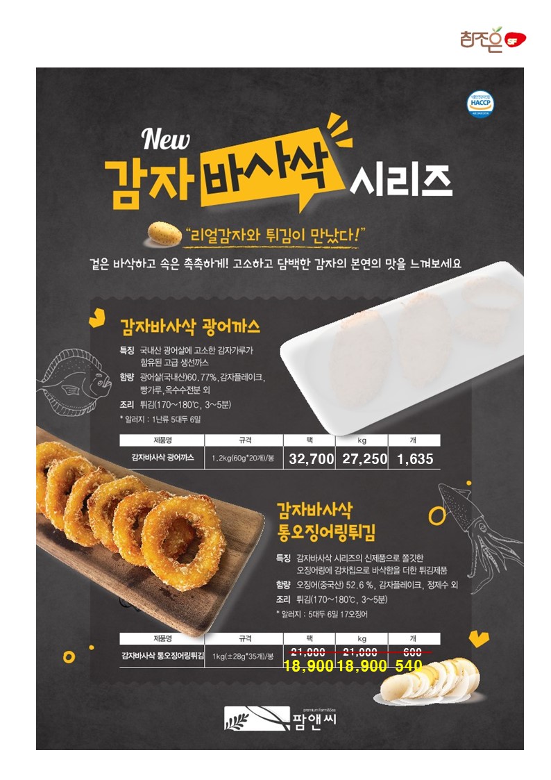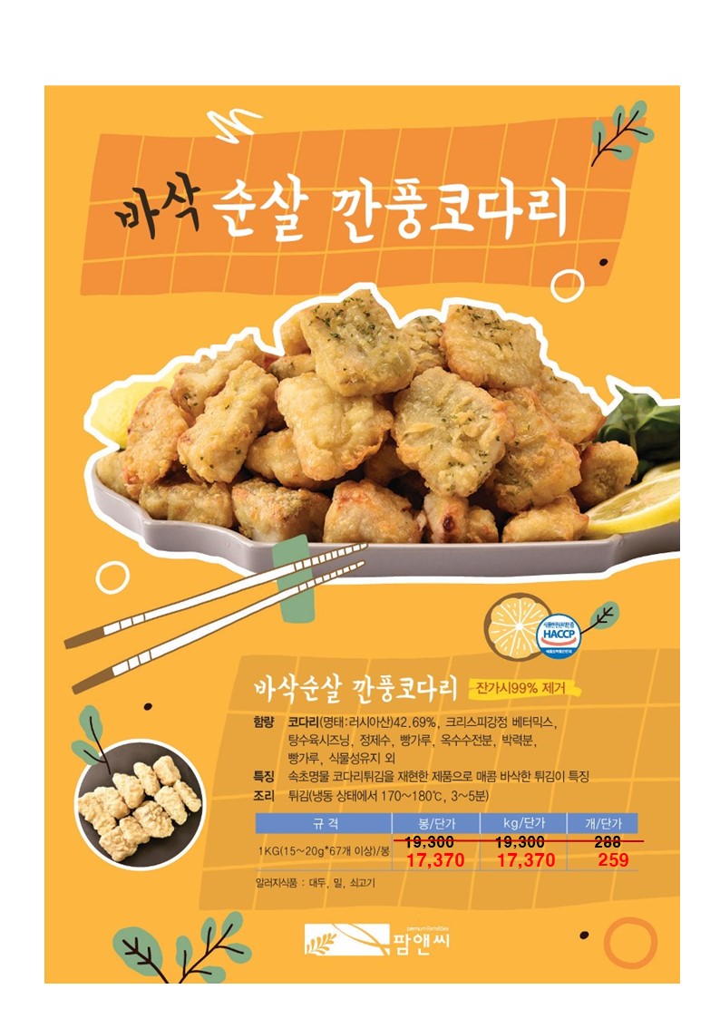 참조은~♠팜앤씨♠[2025년 7월 단가표](하동녹차바다장어,싱싱참대구코다리알탕세트,명태까스,광어까스,바다장어튀김,아귀튀김,깐풍꼬다리,초당옥수수완자전, 쭈구미탕탕이전,연어스테이크,통살새우꼬지,감자말이새우,치즈볼,대하새우살,버터플라이적새우,블랙타이거새우, 광어살강정세트,해물탕,소라쭈구미채,오징어링튀김등)