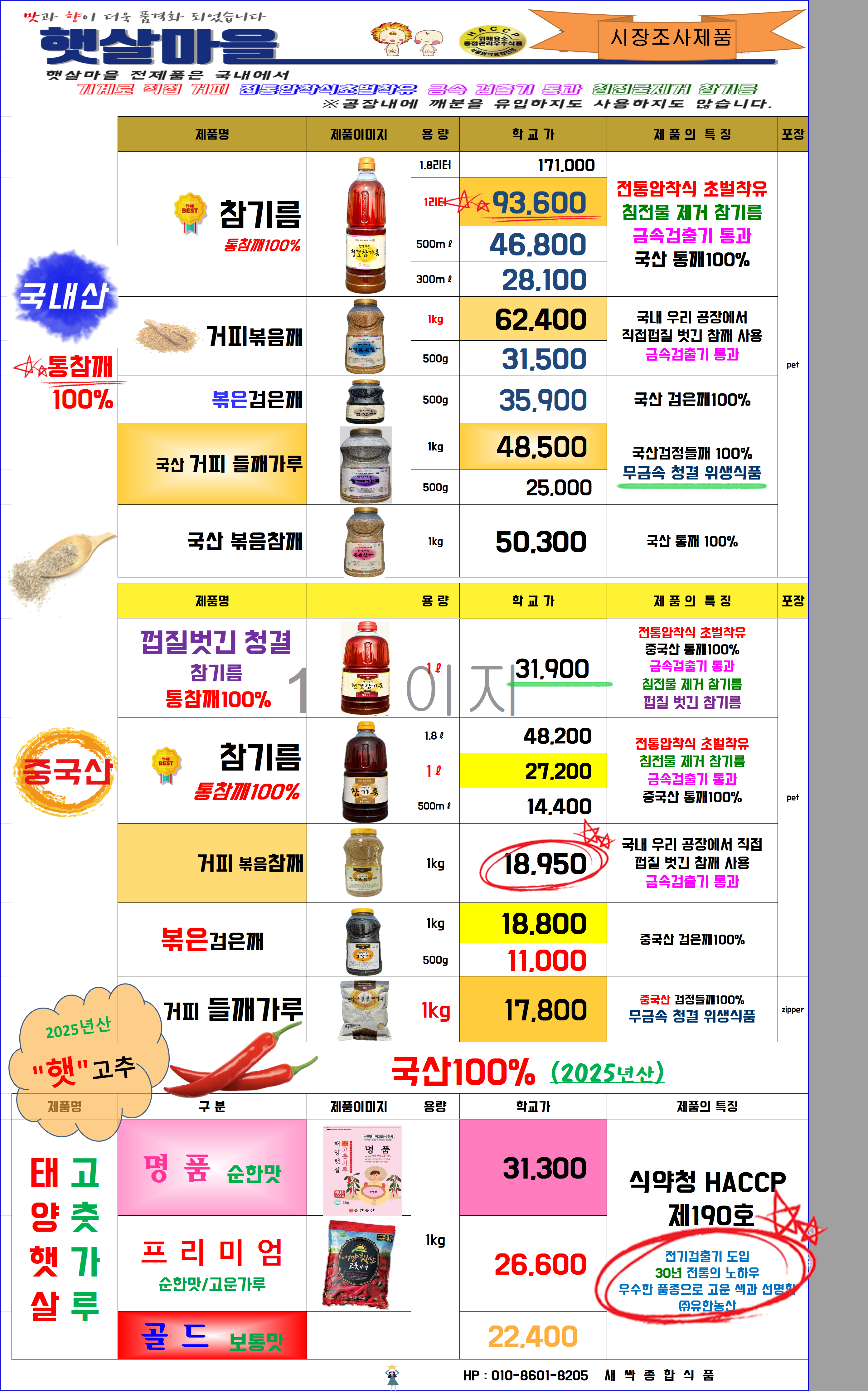 ★새싹★10월★햇살마을참기름★맛있고품격있는★국산참기름93,600원★국산거피볶음깨62,400원★시골방앗간의 맛과향으로 품격있는 햇살마을 참기름 단가표