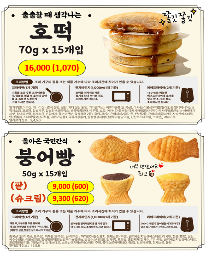 앙버터호두과자, 호떡, 붕어빵, 찌빵, 폭립, 차슈,,,