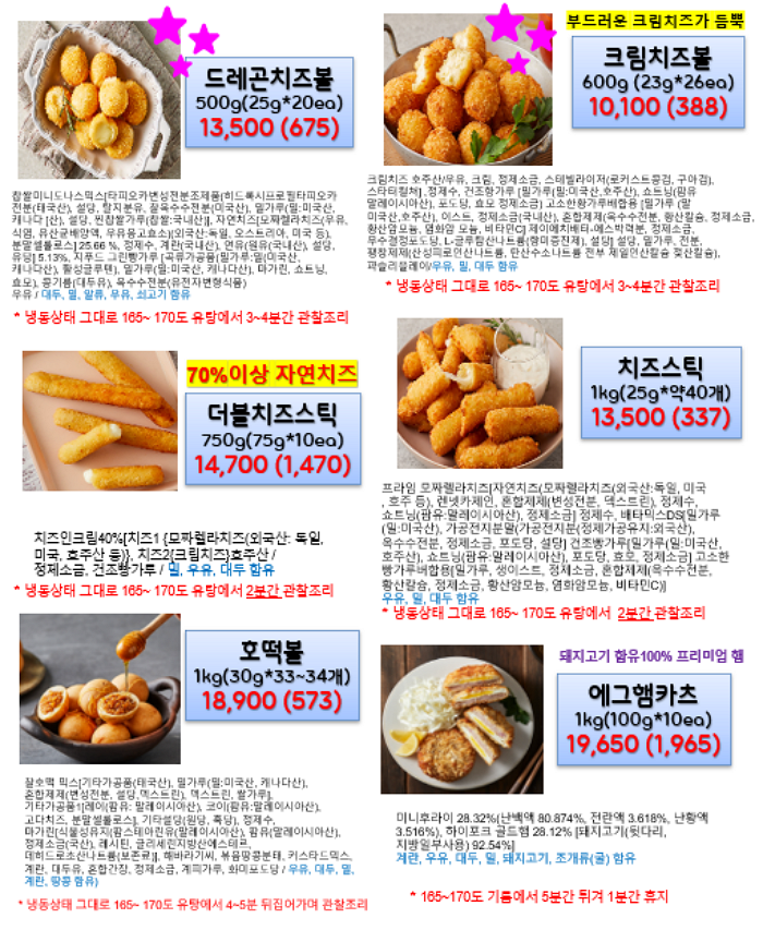 피자, 멘보샤, 감자채전, 큐브치즈, 고로케, 츄러스, 아란치니, 유부모찌주머니, 버섯탕수 ,,,