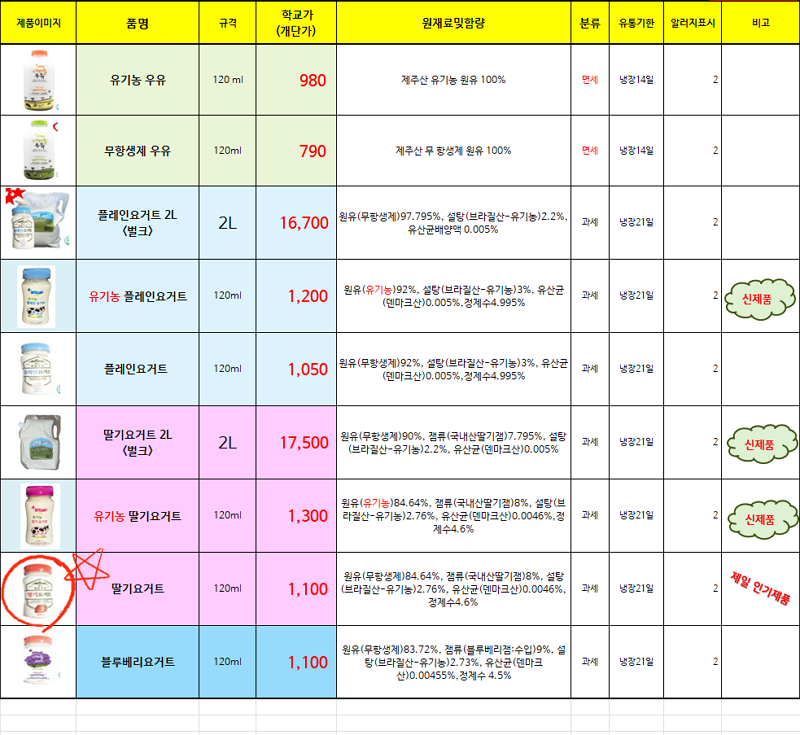 ** 푸드마일 제주샘물목장 11~12월 단가표입니다 ** 딸기요거트, 블루베리요거트, 플레인요거트, 유기농요거트