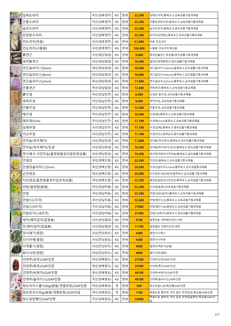 기운찬❤️미들찬❤️11 단가표 깐밤,깐마늘,손깐생강,고사리,우거지,채도라지,연근, 건곤드레 생데친곤드레 건무청시래기 건…