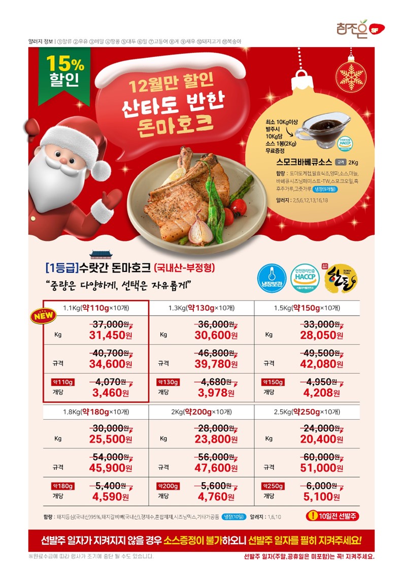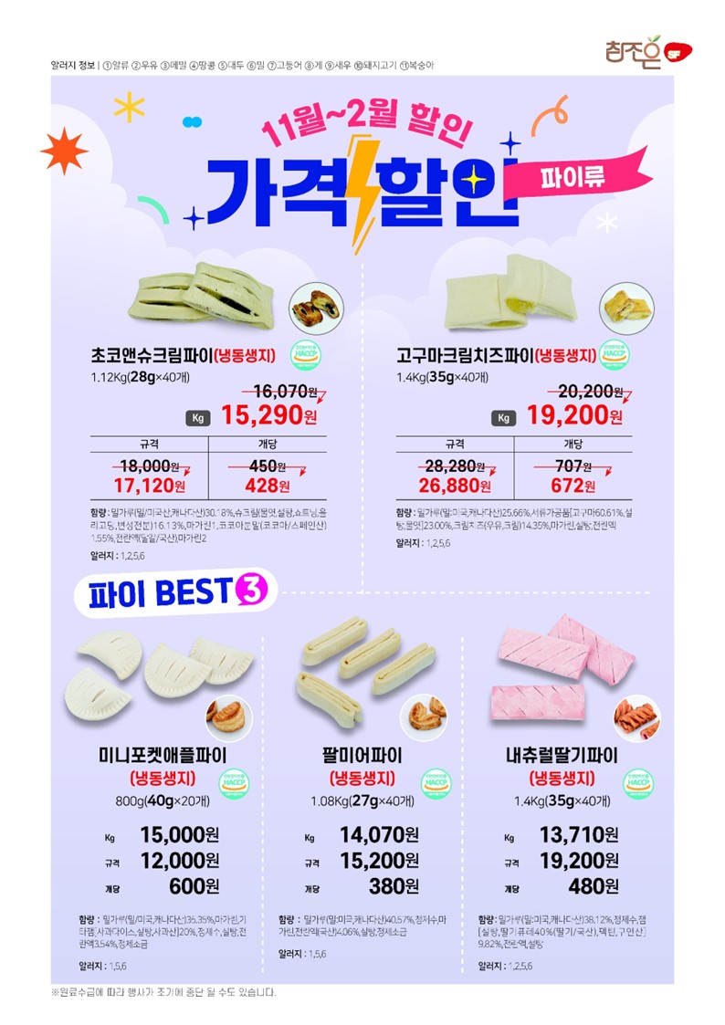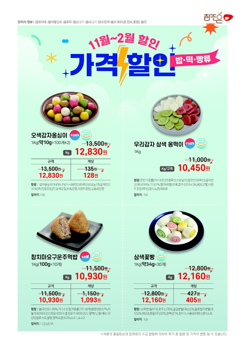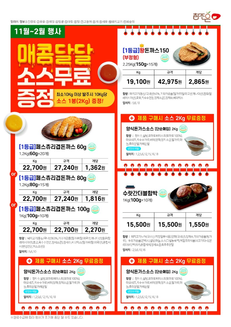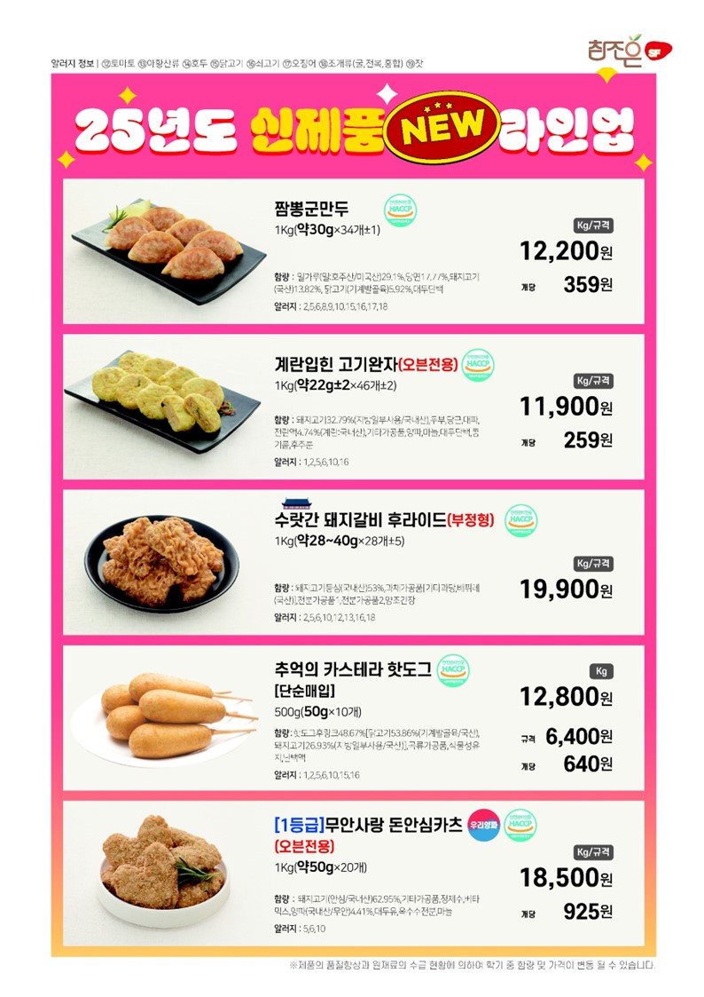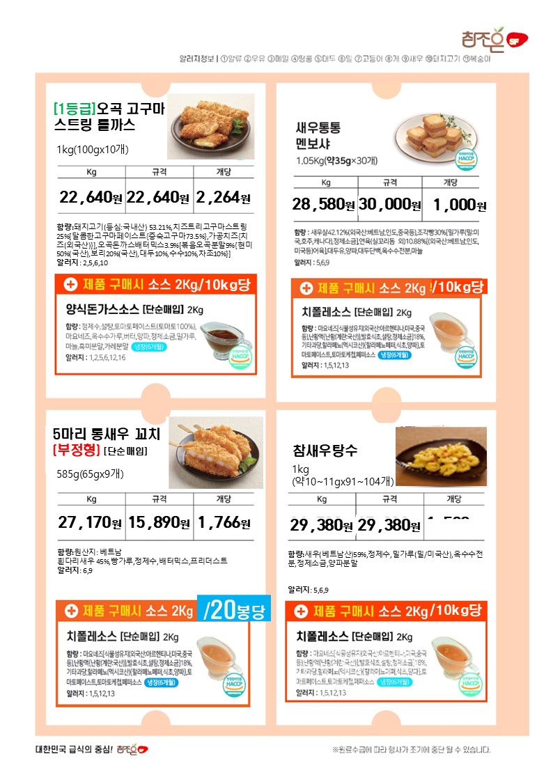 ♠참조은♠[2025년 12월 단가표](우리밀꿀뚝쏙산타,오폐라브라우니케익,메리스노우케익,밀크초코볼케익,프리미엄자숙꼬마전복,세줄옹떡이,우리쌀꼬마김밥,크리미머쉬룸포타쥬,통큰고구마튀김,감탄케익,무안사랑돈안심카츠,우리쌀크런치 오징어 꿔바로우,우리쌀크런치명태까스,짬뽕군만두.오리지널큐스테이크,la갈비맛큐브스테이크,통치즈가스, 통큰더블함박,수랏간돌돌떡말이,수랏간돼지갈비후