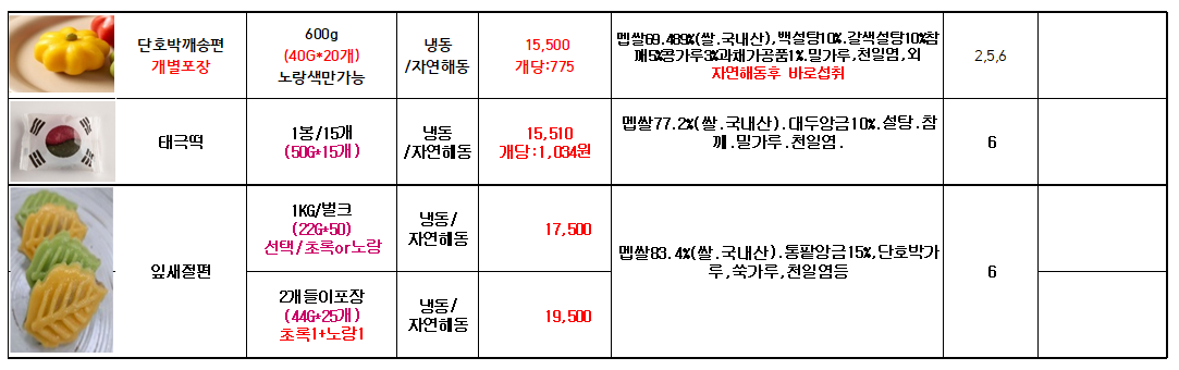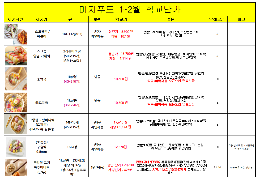 ★★한맥푸드★★ 미지식품(꽃떡국,하트떡국,만두떡,떡마리,초코설기,치즈설기) 1~2월 단가표